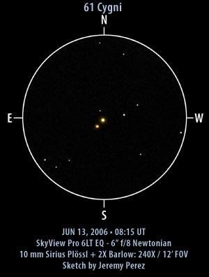 In the star of the month for June 2020, I discuss stars that move fast across the sky, or more precisely stars with a high proper motion. The fastest is Barnard’s star which is the star of the month for June 2020, but before the discovery of the high proper motion of Barnard’s star in 1916, 61 Cygni was one of the fastest stars known. The rapid motion of 61 Cygni was discovered by Giuseppe Piazzi of Palermo Observatory in 1804 and the German astronomer Friedrich Bessel measured its distance as 10.3 light years (it is actually 11.4 light years) in 1838. Thomas Henderson, His Majesty’s Astronomer at the Cape (Cape of Good Hope in South Africa), was concurrently measuring the parallax of Alpha Centauri but he resigned his position and returned home to Scotland on the grounds of ill-health in 1833, and did not publish his measurements until 1839. However our focus here is on 61 Cygni as a double star. James Bradley, the Astronomer Royal, observed 61 Cygni as a double star on 25 September 1753, making it one of the first relatively close double stars to be noted. It was also extensively studied by William Herschel, who hoped to use double stars to measure parallax on the assumption that they would nearly all be optical doubles, which soon turned out not to be the case.