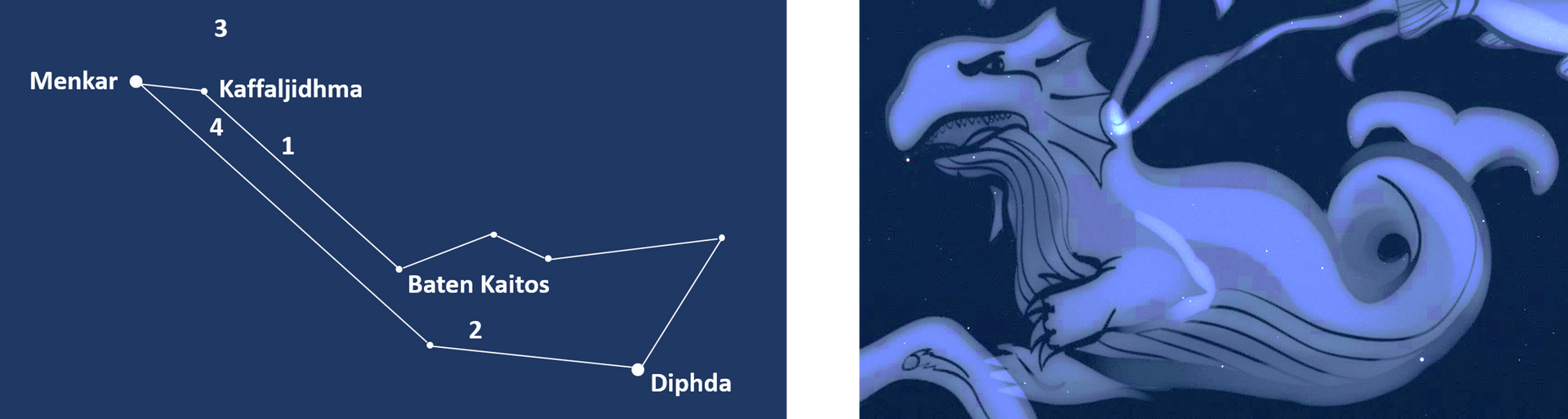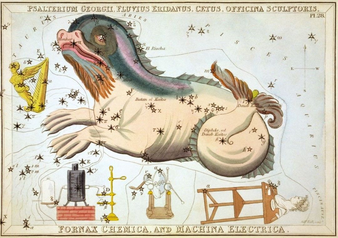 Cetus is an ancient constellation. Sometimes mistakenly called a whale, it is really Ketos, an ancient Greek term for a sea monster. It was drawn with the front end of a fearsome land animal with gaping jaws and the rear of a sea serpent. In the story of Cassiopeia and Andromeda, Ketos was sent by Poseidon to harry the coast of King Cepheus’ kingdom. An oracle told Cepheus to offer his daughter Andromeda as a sacrificial victim to the monster, but she was rescued by the hero Perseus. We can imagine Ketos swimming rapidly up the sky, past Pisces, to reach the chained Andromeda.