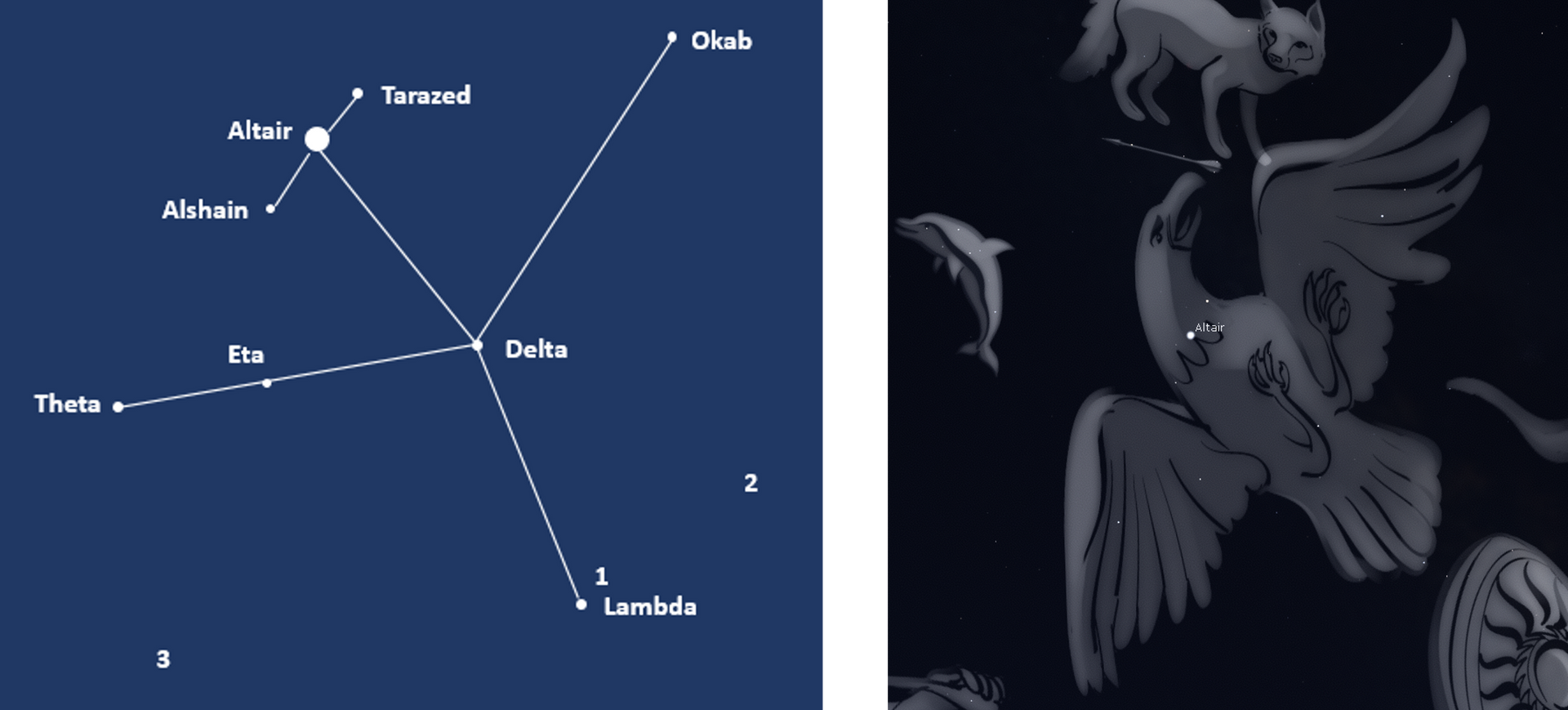 Aquila is dominated by the trio of bright stars: Alshain, Altair and Tarazed. However, it lacks any Messier or Caldwell objects, despite the Milky Way running just to the west of the constellation.