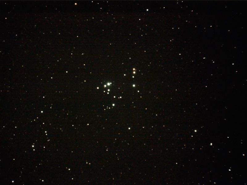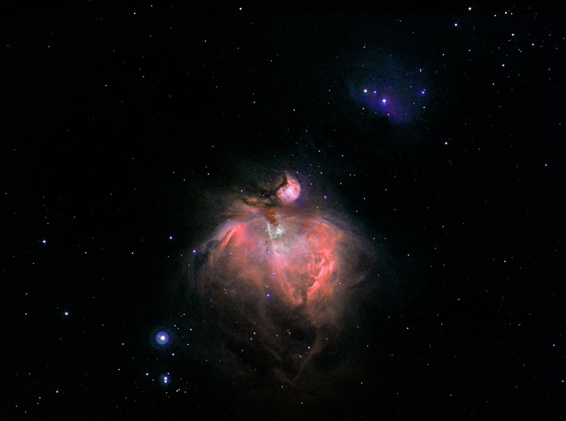 The most prominent features of Orion are its belt of three closely spaced stars and hanging down from the belt, the sword which contains that most wonderful of sights, the Orion Nebula [1] which is also called Messier 42. Visible to the naked eye, even in Havering, it is even more splendid in binoculars or a telescope. It is a giant cloud of gas and dust in which new stars are being formed.