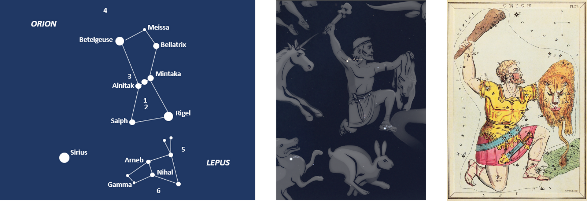 Orion is one of the few constellations that is both easily recognised and like the figure it is meant to represent. It is easily spotted to the south on winter evenings with its seven bright stars. Under Orion is another ancient constellation, Lepus, the Hare, which looks like a hare with two ears, but being so low down is not so easy to make out. Diagonally opposite each other, and almost equally bright, Betelgeuse (often pronounced “beetlejuice”) is a red supergiant while Rigel is a rare blue supergiant, although to the naked eye they look orange and white. Three years ago, at the beginning of 2020, Betelgeuse dimmed quite dramatically for about three months, probably caused by huge clouds of soot on its surface. Most of Orion is connected and is about 1,300 light years away in a neighbouring arm of the Milky Way.