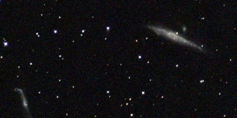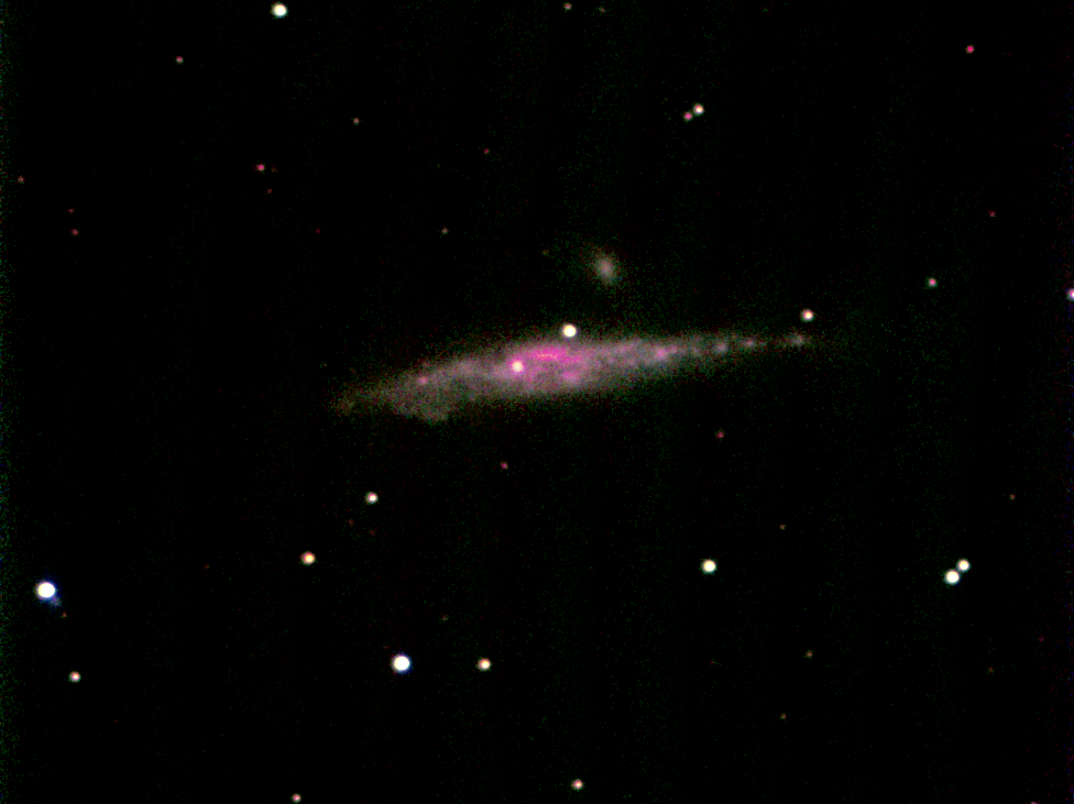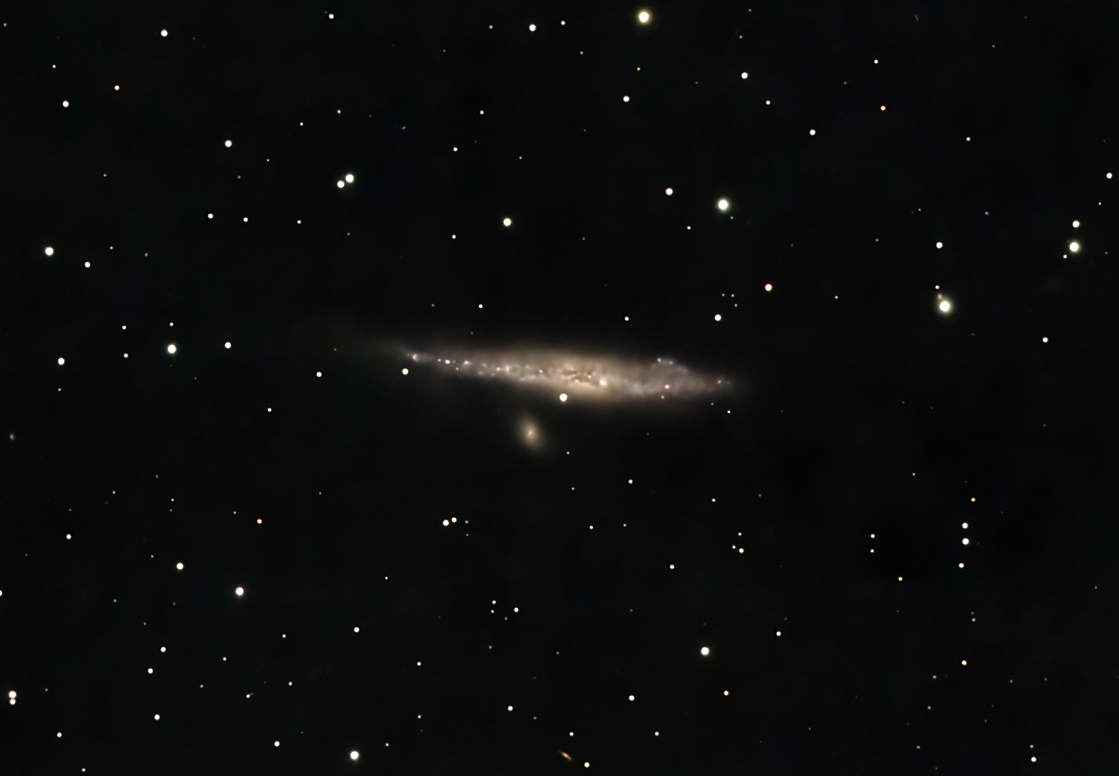 NGC 4631 (also known as the Whale Galaxy or Caldwell 32) is a barred spiral galaxy in the constellation Canes Venatici. This galaxy's slightly distorted wedge shape gives it the appearance of a herring or a whale, hence its nickname. Because this nearby galaxy is seen edge-on from Earth, professional astronomers observe this galaxy to better understand the gas and stars located outside the plane of the galaxy.
