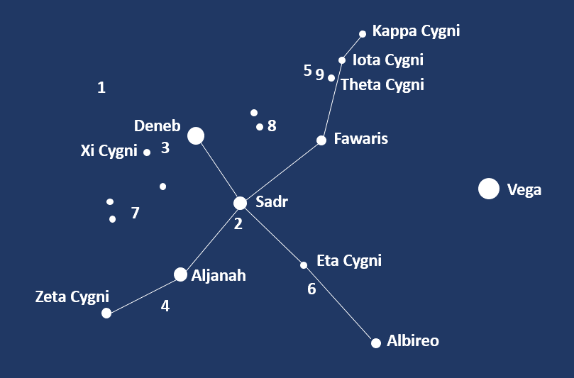 There are several good double stars in Cygnus. The most famous is Albireo which is famously golden-yellow and cobalt blue. The colours make sense from a scientific point of view, the primary star (the brighter one) is a cool K2 yellow star and the secondary (the dimmer star) is a hot B8 blue-white star. Their proximity and the contrast in colours emphasise the colours which would be much paler if they were solitary stars. It had been assumed they were a binary system, gravitationally bound to each other, but they may be an optical coincidence in the sky (an optical double), we are not sure. Another double star in Cygnus, 61 Cygni [7], was the first star to have its distance accurately measured using the technique of parallax, by Friedrich Wilhelm Bessel in 1838. Its distance is now put at 11.4 light years. It is a wide pair of tangerine-orange stars which lies between Deneb and Zeta Cygni, near a pair of fourth magnitude stars. 31 Cygni (Omicron1 Cygni) [8] (mag. 3.9) forms a very wide double with 32 Cygni (Omicron2 Cygni) (mag. 4.2)—they are about a degree apart—but more importantly it forms a wide double with 30 Cygni (mag. 4.8) and a narrower but still wide double with 31 B Cygni (mag. 7.0). 31 Cygni is a K type star, 30 Cygni is a A type star and 31 Cygni B is a B type star. I see them all as white, but arguably they should be yellow, blue and blue. 16 Cygni [9], is a double which is about as wide as Albireo, comprised of two equally bright stars (mag. 6.0 and 6.2) which are both sun-like (G type); I see them both as white. It lies between Theta Cygni and the Blinking Planetary Nebula.