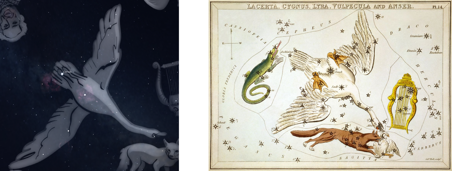 Cygnus is the constellation of the Swan, and it is one of the relatively few constellations that looks like its name, a bird with large wings and a long neck. It is supposed to represent Zeus who took the form of a swan to seduce Leda, a mythological queen of Sparta in Greece. As a result of her liaison with Zeus, she gave birth to Helen of Troy. The main stars in Cygnus are also known as the Northern Cross. It lies in the Milky Way and I can remember seeing the Milky Way in Cygnus in Upminster in the 1960s; sadly, this is no longer possible. Below Deneb is a dark region known as the Cygnus Rift. Deneb is a hot A type star and as a result it is a bright star (magnitude 1.3) despite being 2,600 light years away – it is one of the most distant stars we can see with the naked eye. It forms one corner of the Summer Triangle along with Vega and Altair.
