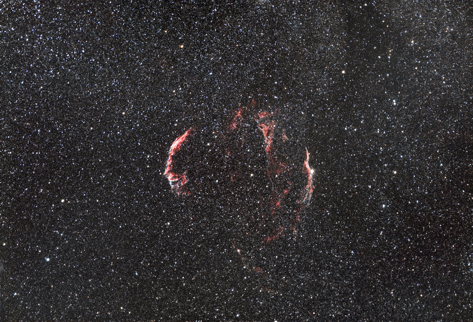 The Veil Nebula [4], Caldwell 33/34, is a supernova remnant which is 36 times the size of the full Moon. I have seen the Witch's Broom Nebula, which is part of the Veil Nebula, in a large telescope in a dark area (it looked like neon lighting), but again it is best seen in images. It is divided into the Eastern Veil, the Western Veil and Pickering’s Triangle (now increasingly named after its actual discoverer Williamina Fleming) in-between; the Witch's Broom is part of the Western Veil. The supernova which formed the Veil Nebula took place between 10,000 and 20,000 years ago, and would have been brighter than Venus when it exploded. It lies 2,400 light years away.