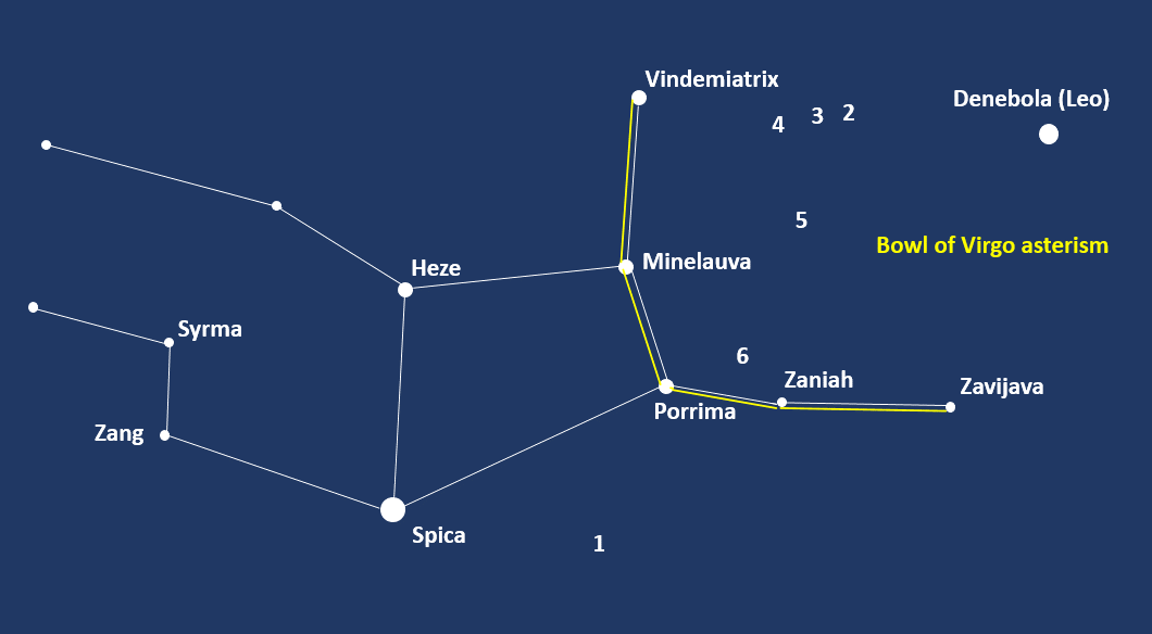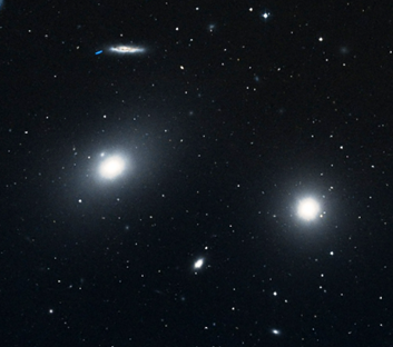Now we are in the right area, we can use another multiple star (STF 1664) to point us exactly to the Sombrero Galaxy. Next, let’s turn to another asterism, the Bowl of Virgo, which is chockful of galaxies. Now draw a line between Denebola in Leo and Vindemiatrix, and roughly halfway are two fairly bright elliptical galaxies close together, Messier 84 and Messier 86 [2]. I would suggest using a good star map or go-to to be on the safe side. They are part of the much larger Markarian’s chain of galaxies.
