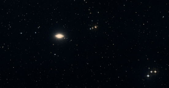 Virgo contains a large number of galaxies which are mostly members of the Virgo galactic cluster and are often elliptical galaxies. However, most galaxies are not easy to see in a small telescope in a light-polluted area, and the simplest course of action is just to forget about them. Unfortunately, this leaves us without much to observe in Virgo. The best galaxy to attempt is the Sombrero Galaxy [1] (Messier 104); not least because it has two arrows pointing to it. The larger arrow is sometimes called the Corvus arrow, a line of mostly sixth magnitude stars which starts above Gienah (see Corvus) and ends with a triangular arrowhead. However, this actually points to the Stargate asterism (STF 1659) rather than M104.