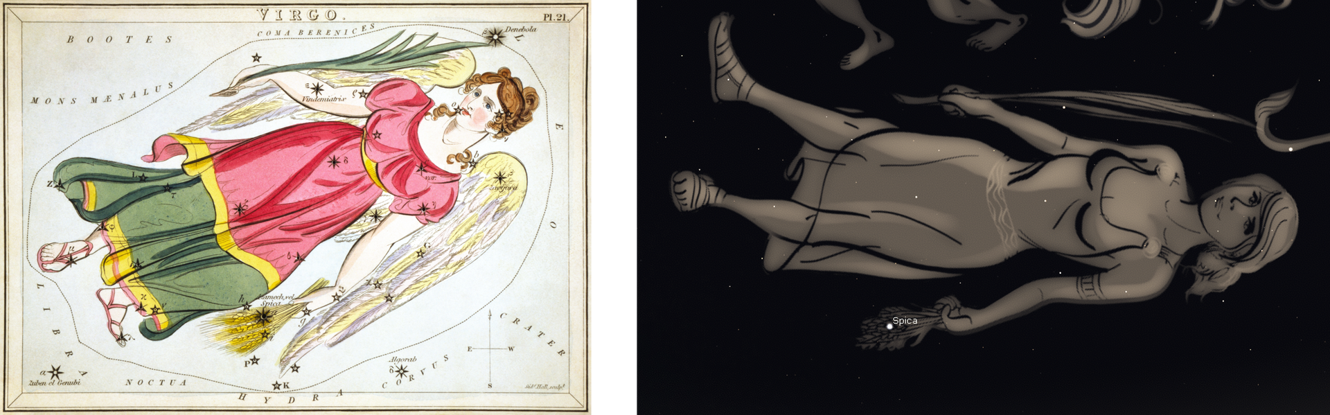 The identity of Virgo has been much debated, with the Greek goddess of justice Dike being a prime candidate. However, Virgo holds a sheaf of wheat (Spica, her brightest star, means an ear of corn in Latin) and she is clearly connected with fertility, which suggests a connection with Demeter, the Greek goddess of fertility (and other fertility goddesses), as the constellation in ancient times first appeared at dawn during the harvest. It is the second largest constellation after Hydra, and likewise it is not easy to make out in a light-polluted area. It resembles a woman lying down (although she is actually standing up) and the brightest stars form the quadrilateral which forms her torso, first magnitude Spica and three stars which are remarkably all magnitude 3.4. One arm is formed by Vindemiatrix (which means grape gatherer) which is third magnitude, but the other stars are all fourth magnitude.