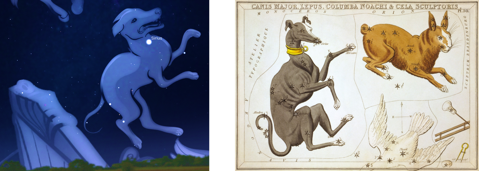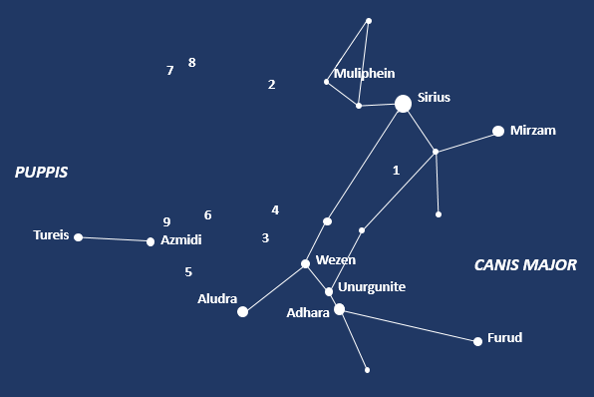 Canis Major is an ancient constellation. It is one of the two dogs accompanying Orion the hunter (the other one of course being Canis Minor) and it is chasing the hare at Orion’s feet. Puppis was part of the equally ancient constellation Argo Navis, the ship of the Argonauts. The break up of Argo Navis was proposed in the nineteenth century, and was formally achieved when the IAU finalised its list of constellations in 1930, despite Argo Navis receiving an official abbreviation (Arg) in 1922. Puppis (the Stern) is the largest and most northern part of the former constellation, but we can only see about a third of it from the UK.