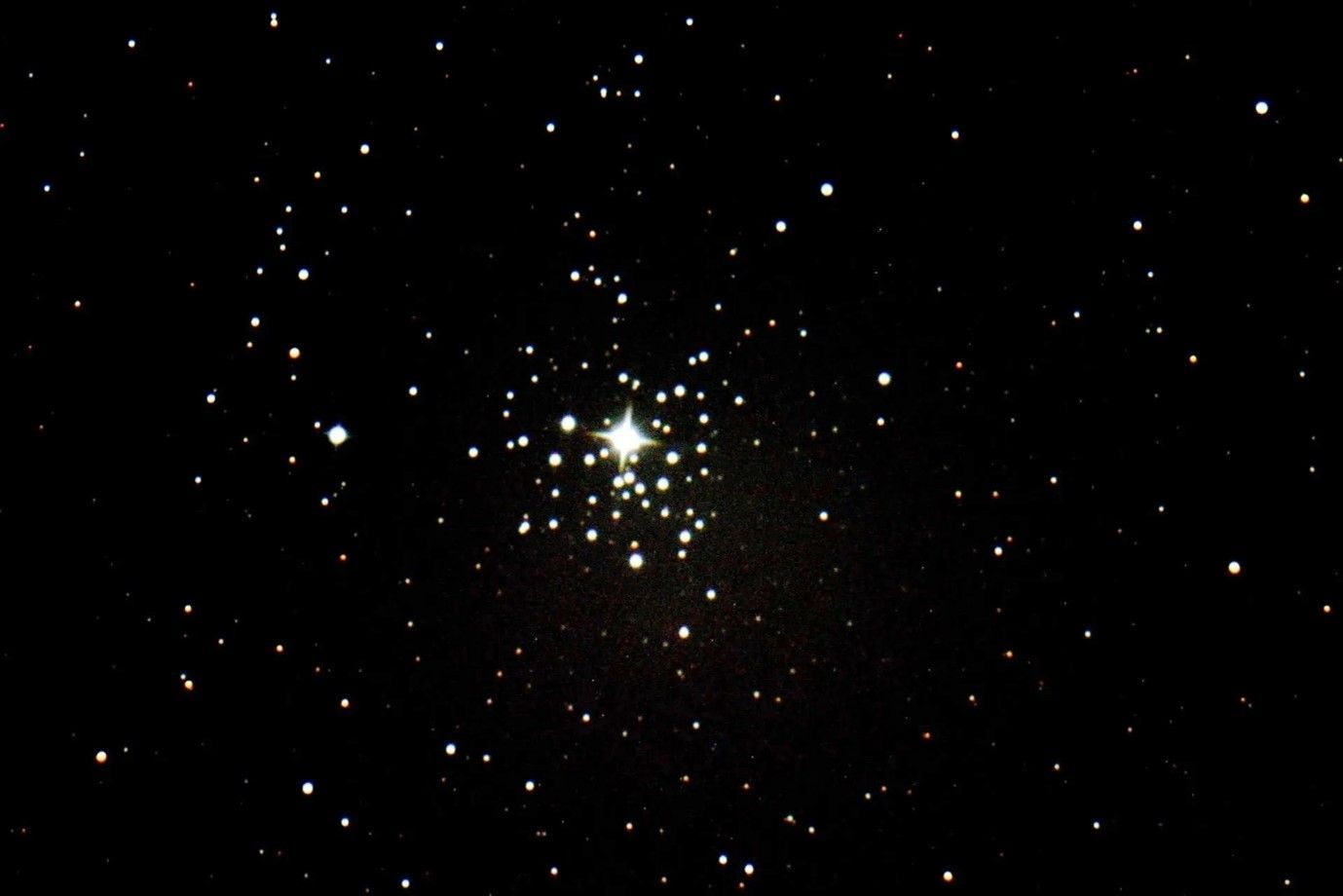 Messier 41 [1] which is a lovely cluster, which looks like the symbol of the Isle of Man, the triskelion - or perhaps a spider. However, although it is relatively bright (magnitude 4.5) and at least in theory easily located, I have had trouble finding it sometimes, probably a result of its low declination. It is about 190 million years old and 2,300 light years distant from us. If it were higher in the sky, it would be a splendid sight. Three degrees east (or left) of Muliphein is Caroline’s Cluster (Caldwell 58) [2], discovered by Caroline Herschel in 1783, which is dimmer and smaller than Messier 41. There is a group of stars surrounding Tau Canis Majoris [3], NGC 2362 or Caldwell 64, which lie on the boundary between multiple stars and a cluster. It is called the Mexican Jumping Bean, because if you look at it through a telescope and then knock its tube, the ring of stars round Tau CMa appear to wobble while the main star stays still. This is a persistence-of-vision effect similar to the Pendulum Star Enif (see
