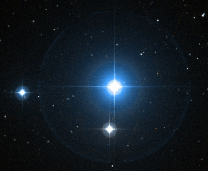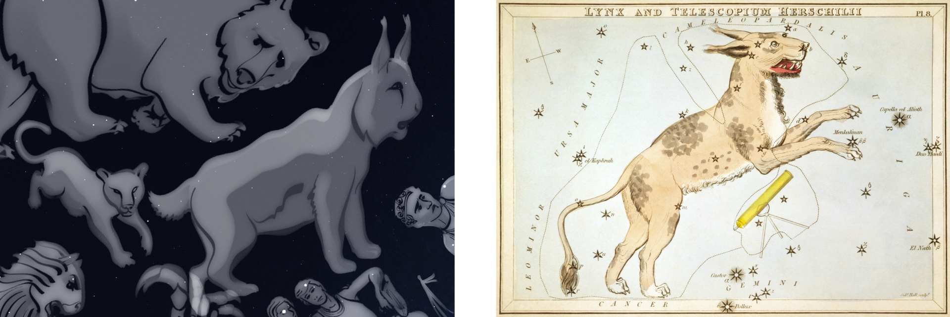 Lynx is another constellation created by Hevelius in 1687. Alpha Lyncis is the brightest star, magnitude 3.1, but the rest are all fourth or fifth magnitude. Even Hevelius admitted it was a difficult constellation to see. There is one bright star in the constellation which has been named by the IAU, Alsciaukat (31 Lyncis). The only deep-sky object in the constellation is an interesting one. NGC 2419 (Caldwell 25) [3] is a globular cluster which was called the Intergalactic Tramp by Harlow Shapley as he regarded as a vagabond travelling between galaxies. While it is even further out than the Magellanic Clouds, being 300,000 light years away, it is gravitationally bound to the Milky Way and is not, strictly speaking, intergalactic. It is only magnitude 10, but can be seen as a tiny blue disc in a five-inch telescope. Fortunately, there is a magnitude 7.2 star (HD 60771), only four arcminutes away, which can be used as a signpost.