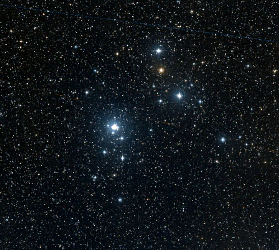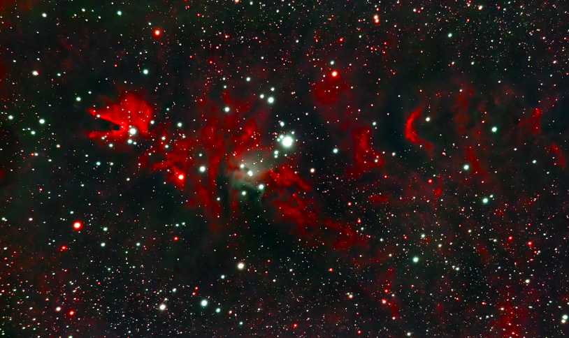 V640 Monocerotis (Plaskett’s star) [8] is a magnitude 6.1 spectroscopic binary discovered by the Canadian astronomer John Plaskett in 1922, which was thought to be the most massive binary star system known, until it was decided around the turn of the century that Eta Carinae was a binary system as well (and more massive). They are both O type stars and the system is 5,250 light years away. The two main double stars in Monoceros are Beta and Epsilon Monocerotis. Beta (or 11) Monocerotis is a triple of relatively bright white stars (mag. 4.6, 5.0 and 5.3) which are close together in a fish-hook shape. They probably gravitationally bound, but it is not certain. William Herschel considered it to be one of the most beautiful sights in the night sky. Epsilon (8) Monocerotis is an easy pair of stars (mag. 4.4 and 6.6) which are yellow-white and pale blue; it is a binary system. Struve (STF) 1183 [9] is a lemon-yellow and blue pair (mag. 6.2 and 7.8) which is very wide.
