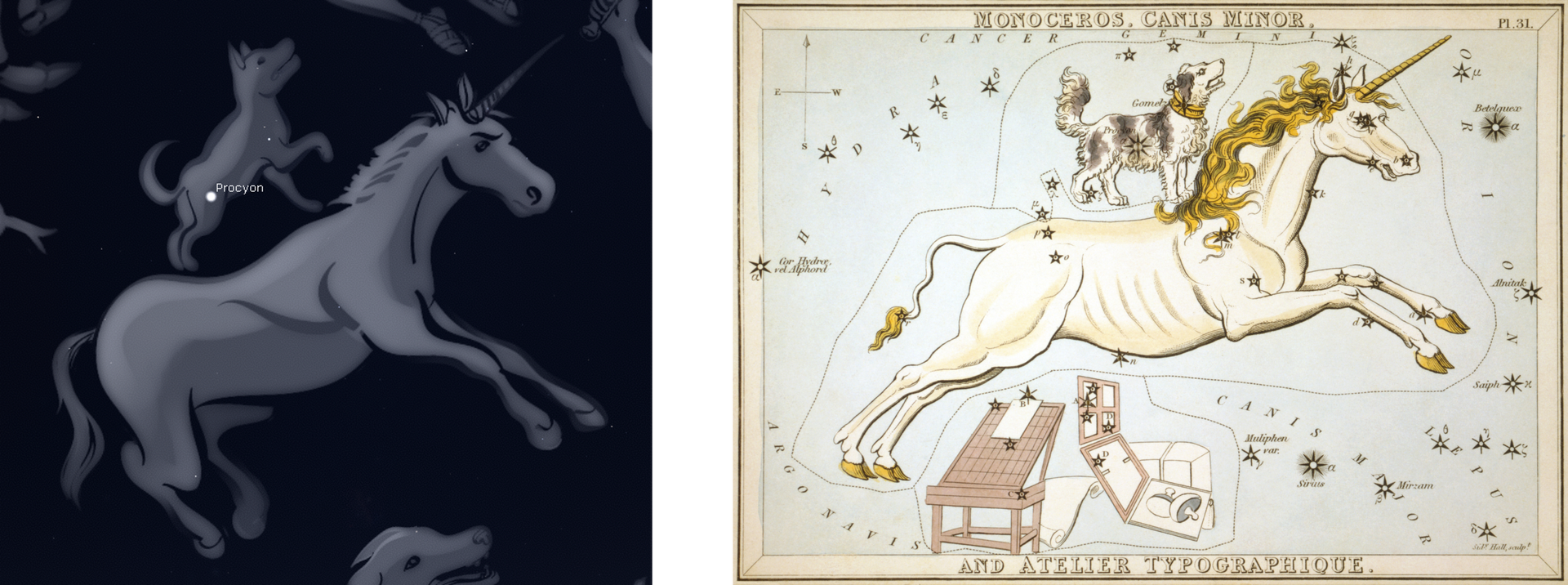Monoceros (the Unicorn) has an unusual origin. Petrus Plancius (Pieter Platevoet), who was born in Flanders but moved to the Netherlands to escape Spanish rule, introduced a number of constellations between 1597 and 1612, some in the southern hemisphere and some in the northern hemisphere. Of his northern hemisphere constellations, only Monoceros and Camelopardalis have survived. Monoceros survived partly because it was accepted by the Polish astronomer Johannes Hevelius in 1690. Plancius was a cartographer and a minister of the Dutch Reformed Church. He may have introduced the Unicorn as a symbol of Christian purity. It is a faint constellation; the brightest star Alpha Monocerotis is magnitude 3.9, and the other stars are fourth or fifth magnitude. Hence it is practically invisible in Havering. None of the (relatively) bright stars in Monoceros have been given a name by the IAU and the lettering of the stars (Alpha, Beta, etc.) was done by Benjamin Apthorp Gould in the nineteenth century, not Johann Bayer.