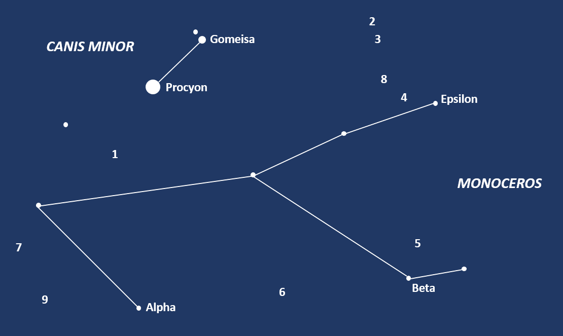 Canis Minor is an ancient constellation which represents the smaller of Orion’s two hunting dogs (although it was also described as the uncatchable fox pursued by the unbeatable dog). Its historical significance lay in its brightest star Procyon heralding the heliacal rising of Sirius in the dawn sky, Procyon being Ancient Greek for “before the dog”. Procyon is a magnitude 0.4 F type star which is relatively close at 11.5 light years and, like Sirius, it has a white dwarf companion, which is too close to be resolved in a small telescope. There are no deep-sky objects in the constellation, but it has a wide double, DD Canis Minoris (STTA 88) [1]. The stars are both white and are magnitudes 7.5 and 8.9. They are a binary system; the third member is a faint (mag. 10.9) line of sight star.