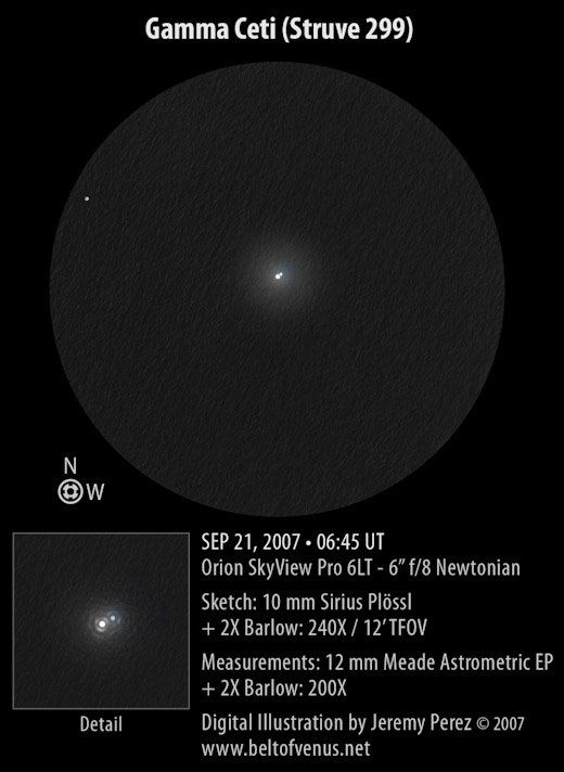 The Danish-Russian astronomer Wilhelm Struve at the observatory in Dorpat (now Tartu, Estonia) created an enormous catalogue of double stars between the 1820s and 1840s. He discovered over 5,000 double stars and his main catalogue contains over 3,000. One of his favourite double stars was Gamma Ceti. This is not an easy double star to observe and you will need a high magnification. The primary is a fairly bright 3.5 (although it may be difficult to see in Havering with the naked eye), but the secondary is a dim 6.2. The difference in brightness and a narrow separation of 1.9 arcseconds make it challenging in a small telescope. It was easier for Struve; he had a six inch refractor and the separation when he found it in 1825 was 2.8 arcseconds. It is a physical system and there is a third member, but C is both dim (10.2) and wide (843 arcsec); it is roughly in the same line as A and B. The system is relatively close at 80 light years distant.