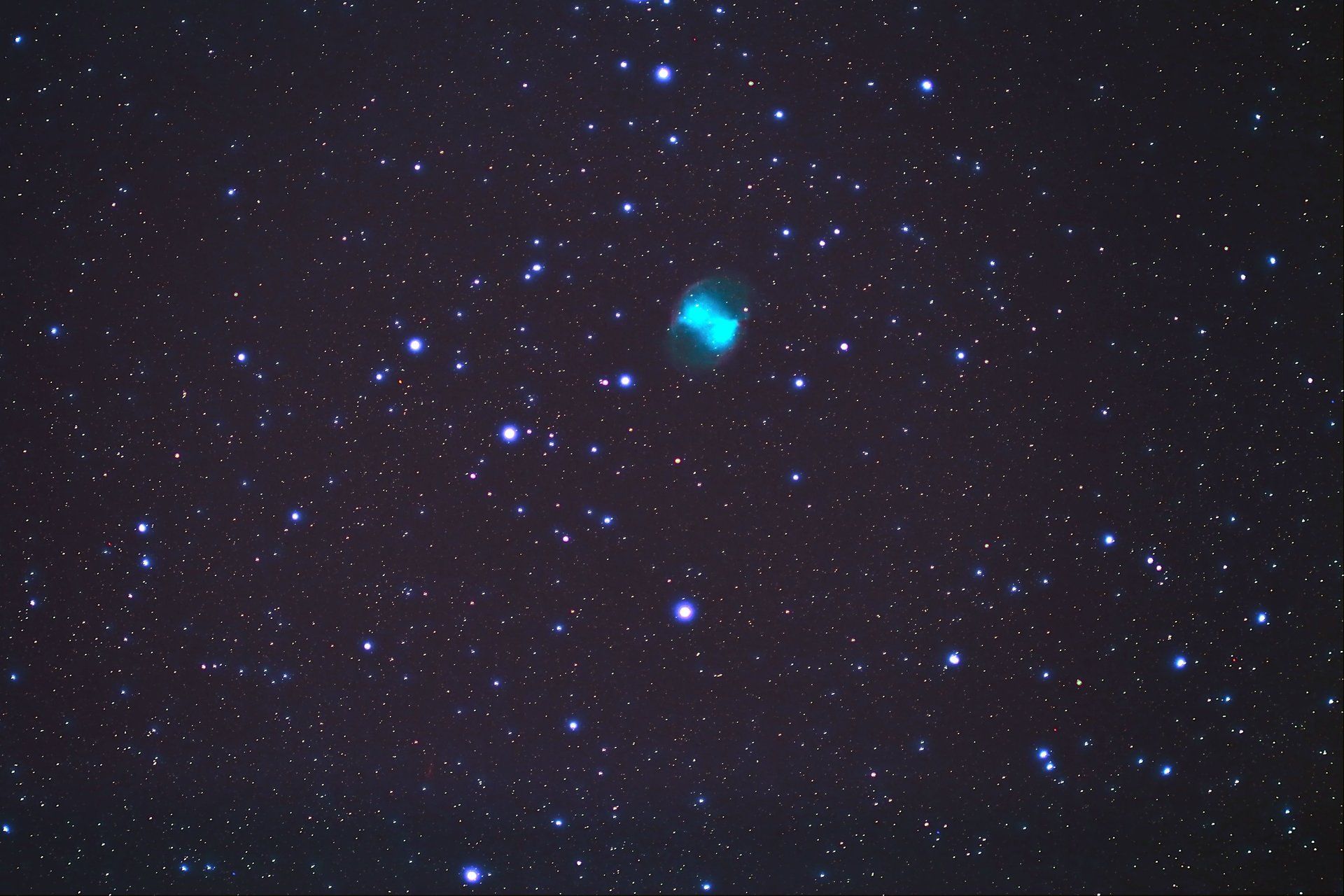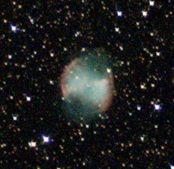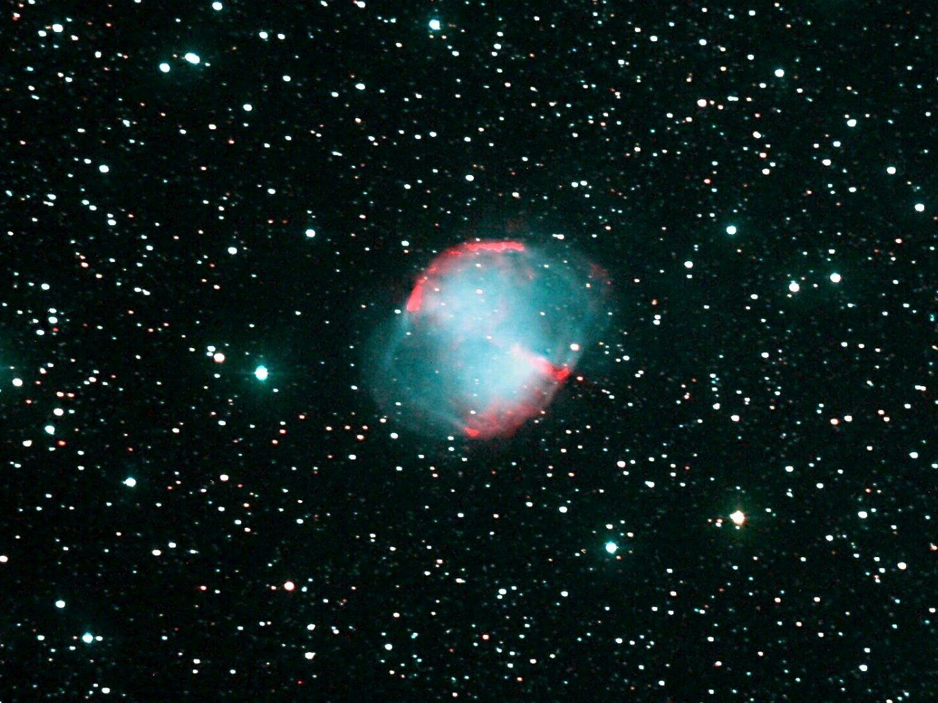 The Dumbbell Nebula (also known as Apple Core Nebula, Messier 27, M 27, or NGC 6853) is a planetary nebula in the constellation Vulpecula, at a distance of about 1,360 light-years. This object was the first planetary nebula to be discovered; by Charles Messier in 1764. At its brightness of visual magnitude 7.5 and its diameter of about 8 arcminutes, it is easily visible in binoculars,[5] and a popular observing target in amateur telescopes.