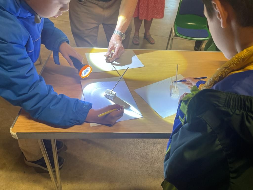 Having been asked to bring scissors and a torch, the Young Astronomers learned about the principles, uses and development of sundials, and about the Sun's varying path across the sky through the year. They were shown some models of different types of sundials used through history.