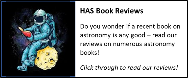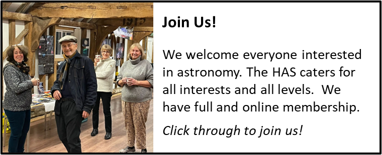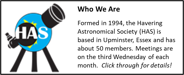 Venue: Thames Chase, Upminster. Dates are tbc, and depend upon clear skies. Go/no go decisions will be circulated via the HAS Observing Group Chat on WhatsApp. NB: no access to buildings or any facilities at Thames Chase during these evenings.