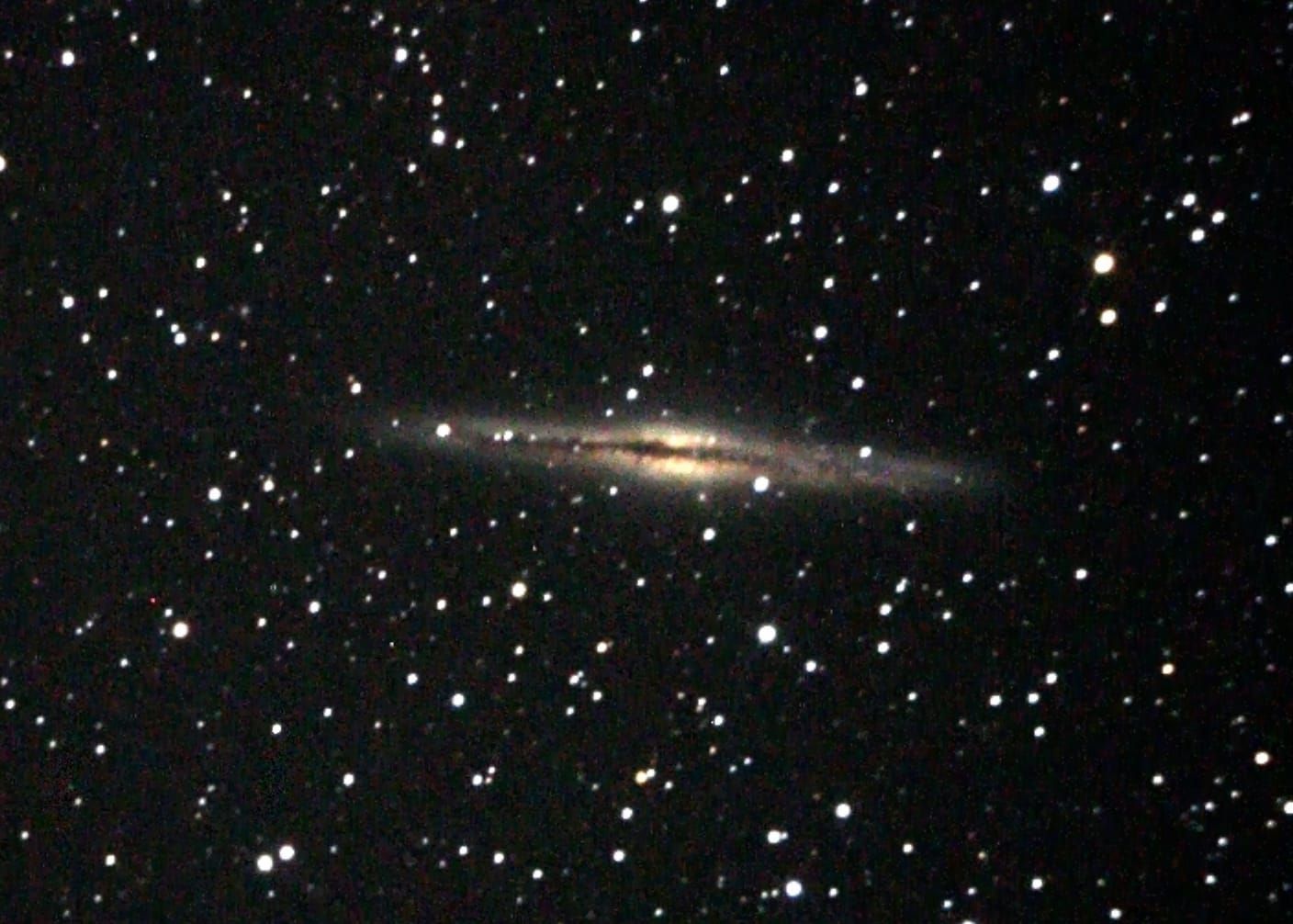 NGC 891 (also known as Caldwell 23 and Silver Sliver Galaxy) is an edge-on unbarred spiral galaxy about 30 million light-years away in the constellation Andromeda. It was discovered by William Herschel on October 6, 1784. The galaxy is a member of the NGC 1023 group of galaxies in the Local Supercluster. It has an H II nucleus.