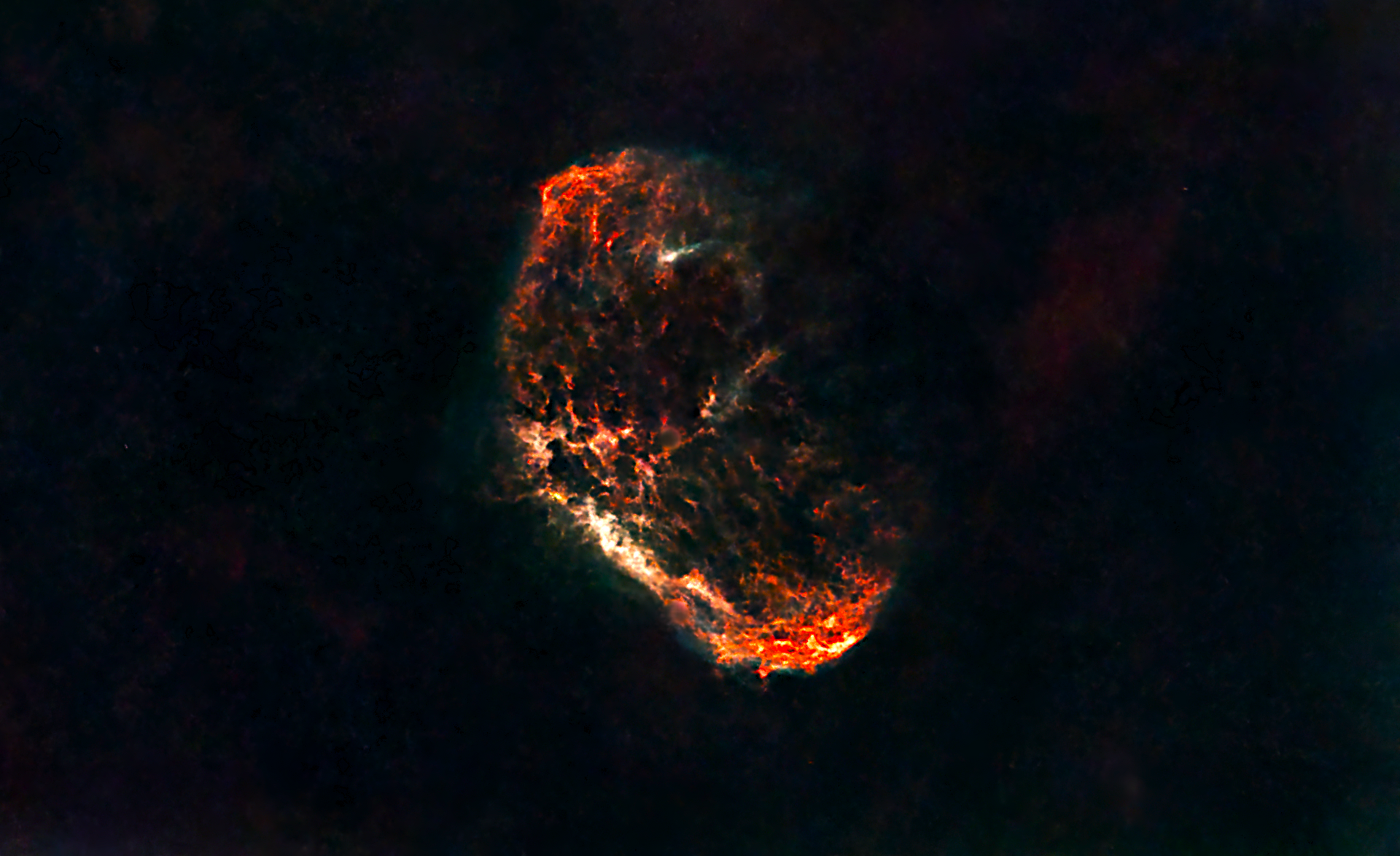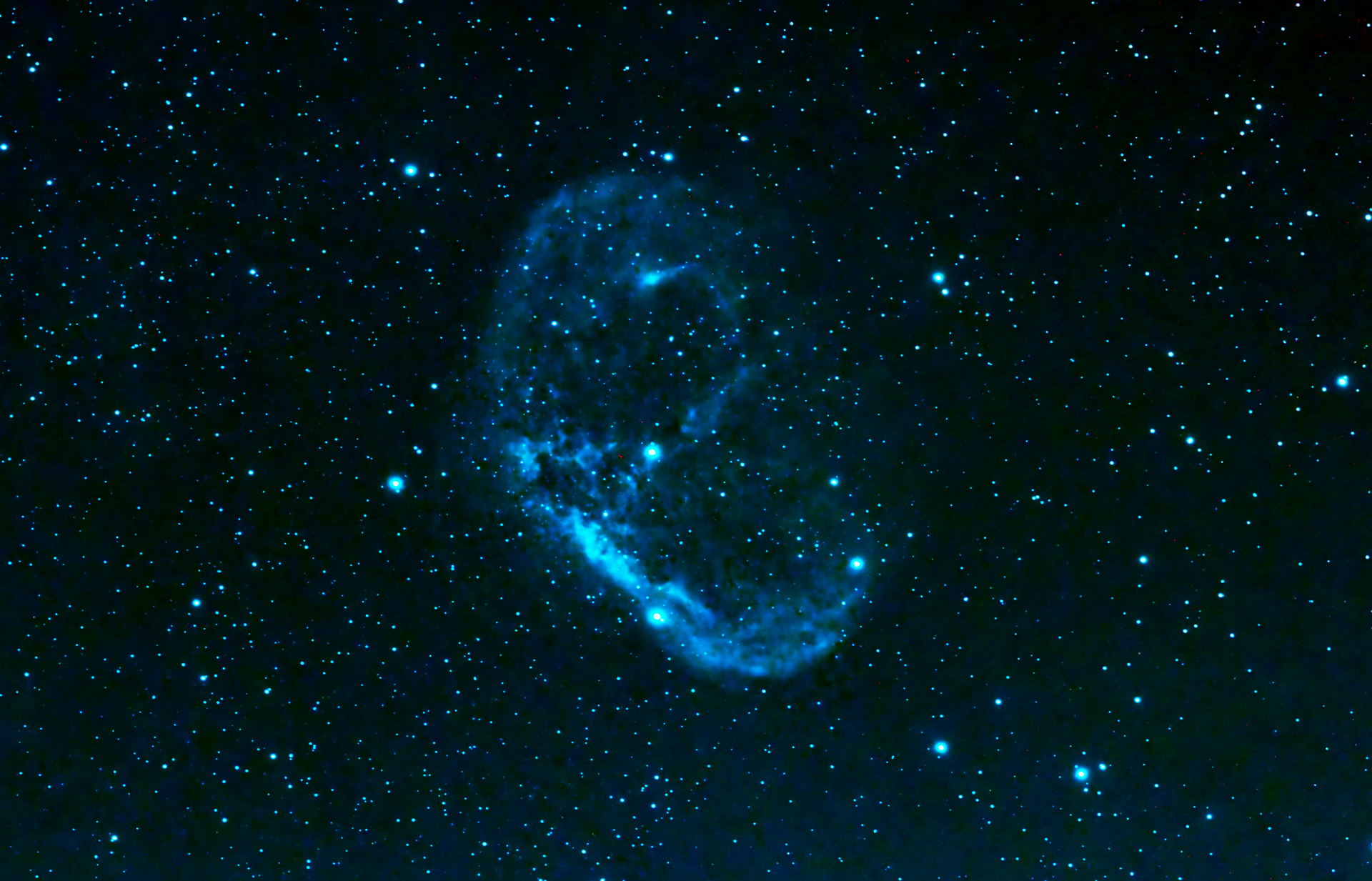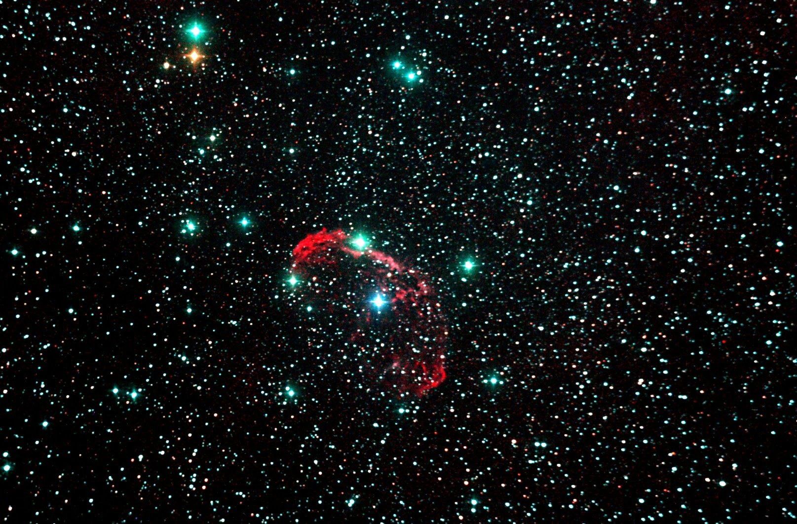 It is a rather faint object located about 2 degrees SW of Sadr. For most telescopes it requires a UHC or OIII filter to see. Under favorable circumstances a telescope as small as 8 cm (with filter) can see its nebulosity. Larger telescopes (20 cm or more) reveal the crescent or a Euro sign shape which makes some to call it the "Euro sign nebula".