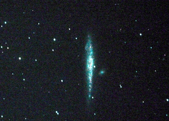 NGC 4631 (also known as the Whale Galaxy or Caldwell 32) is a barred spiral galaxy in the constellation Canes Venatici. This galaxy's slightly distorted wedge shape gives it the appearance of a herring or a whale, hence its nickname. Because this nearby galaxy is seen edge-on from Earth, professional astronomers observe this galaxy to better understand the gas and stars located outside the plane of the galaxy.