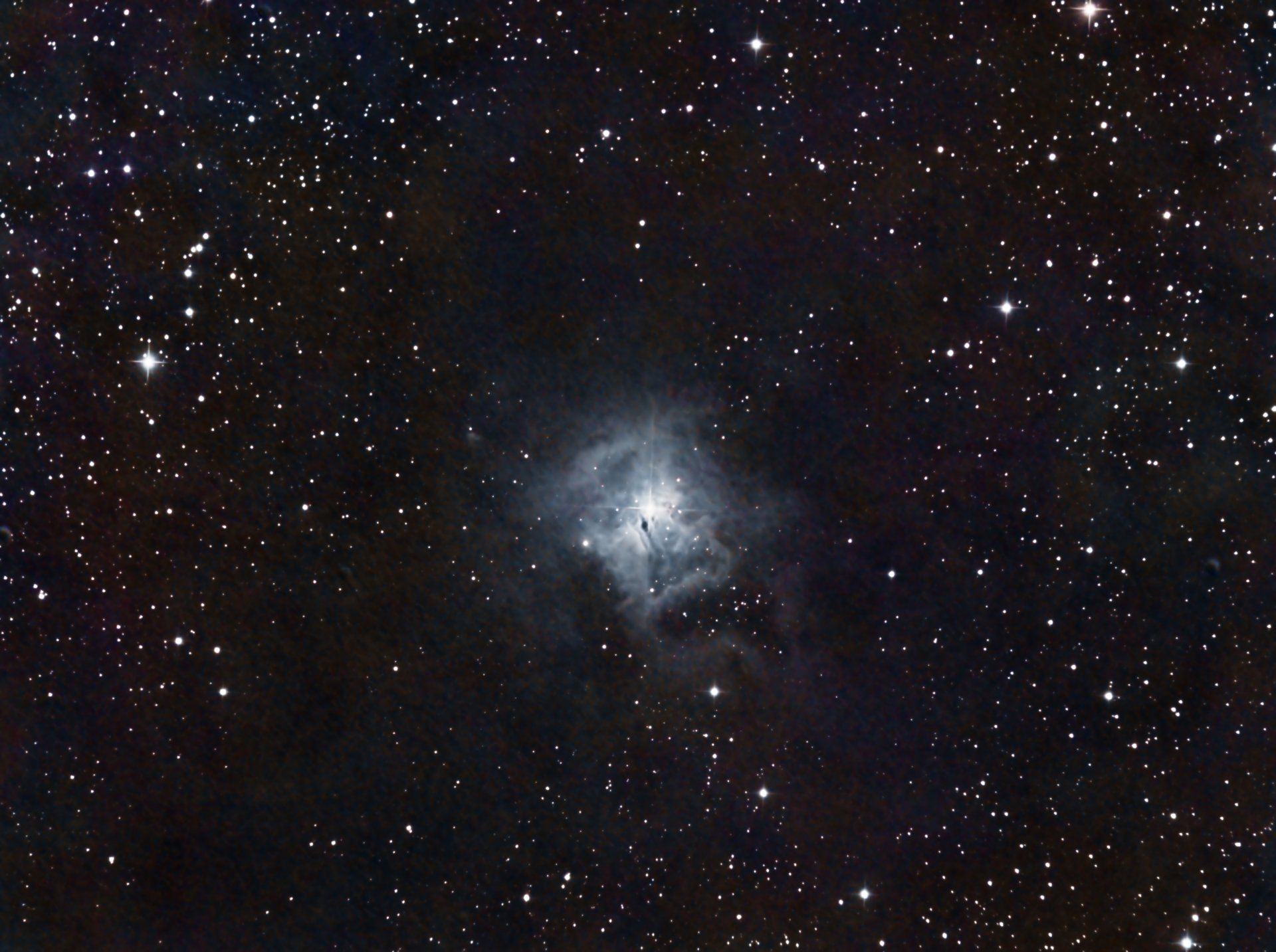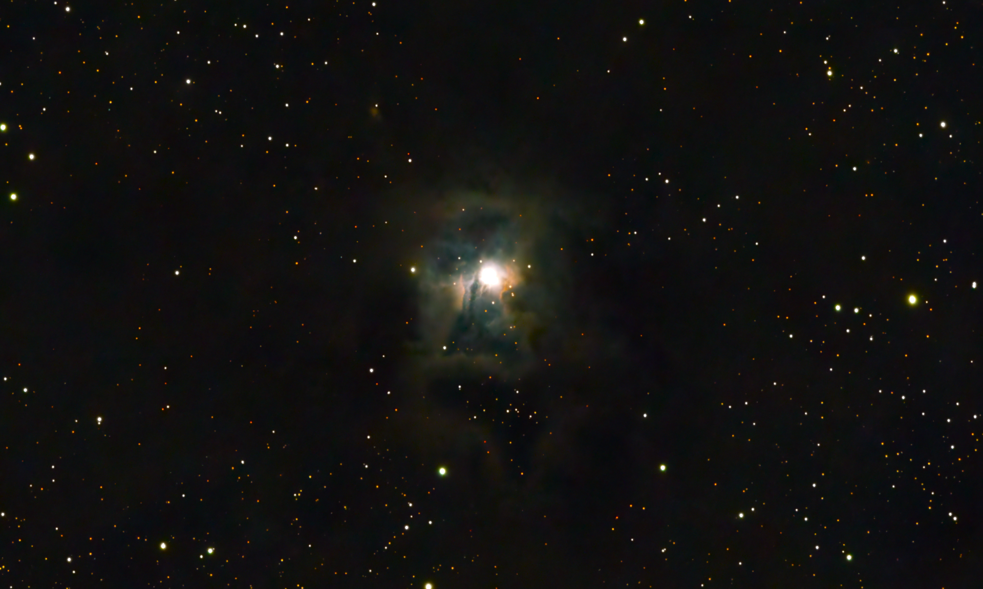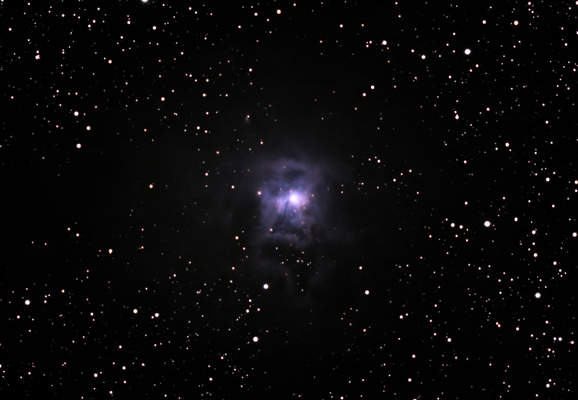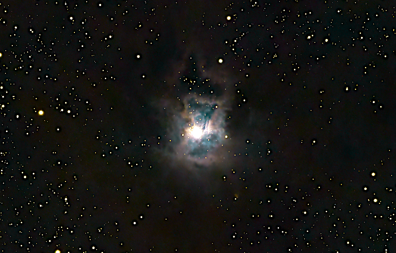 The Iris Nebula, also known as NGC 7023 and Caldwell 4, is a bright reflection nebula and Caldwell object in the constellation Cepheus. NGC 7023 is actually the cluster within the nebula, LBN 487, and the nebula is lit by a magnitude +7 star, SAO 19158. It shines at magnitude +6.8. It is located near the Mira-type variable star T Cephei, and near the bright magnitude +3.23 variable star Beta Cephei (Alphirk). It lies 1,300 light-years away and is six light-years across.