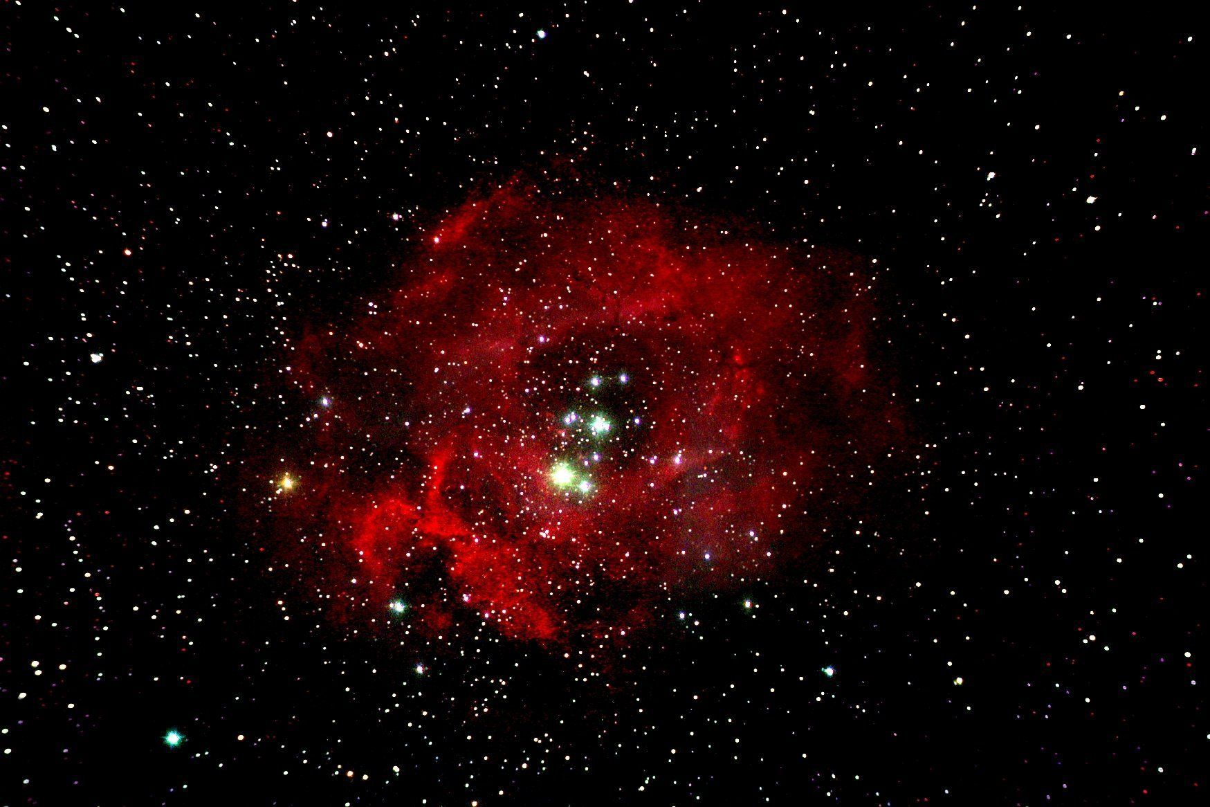 Visually the cluster is quite bright, being magnitude 4.8, and it is rather smaller than the full Moon. It was discovered by the Astronomer Royal John Flamsteed in 1690. To find it follow the line made by Lambda Orionis (Meissa) and Betelgeuse (Alpha Orionis) until it is directly above Sirius. It is just to the east (or left) of the well-known double star Epsilon (8) Monocerotis. The brightest star in the group, 12 Monocerotis, is actually a foreground star as it is only 466 light years away while the cluster is 5,300 light years distant; it is magnitude 5.8. It is not clear why it is called the Satellite Cluster and the name appears to be of recent origin. Given the current importance of satellite clusters (and satellite constellations) in the literal sense, it is perhaps a name that is best forgotten. Now let’s turn to the Rosette Nebula like a red wreath. It is still a star-forming region and the powerful ionising radiation from the young O stars in the cluster excites the gas in the surrounding nebula, producing mostly H-alpha radiation in the visible region. There is also X-ray emission, but fortunately that is blocked by our atmosphere as well as being invisible. You might think this would create a visual spectacle like the Orion Nebula, but unfortunately it does not. The Rosette Nebula is not as bright as M42 and the red hydrogen-alpha radiation is not perceived very well by the rods in the human retina used for night vision. Using a hydrogen-alpha filter only makes matters worse in contrast to an OIII filter. In dark conditions it is possible to make it out as a grey fuzzy circle with a telescope or large binoculars, but it is not particularly spectacular. It is really is one of these deep-sky objects which are best left to imagers.