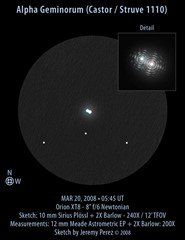 The main pair is relatively nearby being about 51 light years distant. The orbit of the two stars is 460 years and hence the separation of the stars varies quite considerably. In the late 1960s the separation was barely 2 arcseconds, so it was a difficult split, but since then it has been widening and has now reached 5.5 arcseconds, and will be almost 6 arcseconds in 2030. They are both hot large A spectral type stars. Their magnitudes are 1.9 and 3.0. There is a third star which is 72 arcseconds below the AB pair, but it is only magnitude 9.8. It is a member of the same physical system but it is far away from the main pair. All three stars are spectroscopic binaries so there are actually six stars in the system. There is no difficulty in finding Castor. Just look for a pair of bright stars above Procyon; the left-hand or south-eastern star, Pollux, is yellowish and the right-hand or north-western star is Castor which is white. The pair looks white or perhaps slightly greenish white. I agree with Herschel that they look more equal in brightness than their magnitude difference would suggest. It is no longer a difficult split but you should use a high magnification: at least 80x and 150x would be even better.