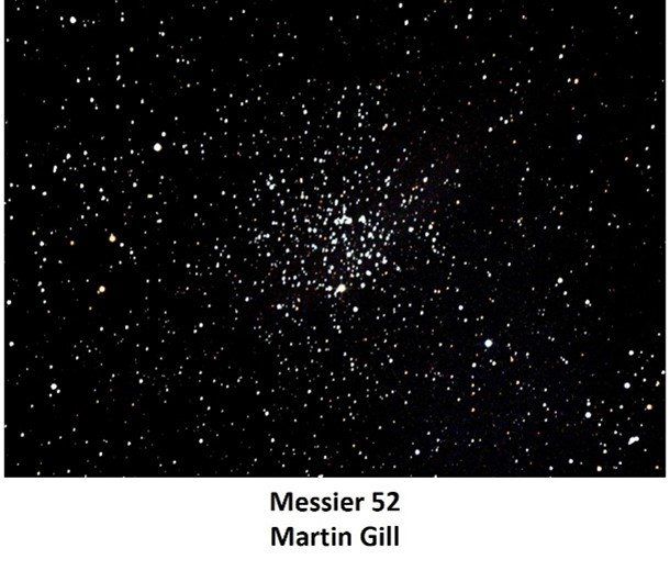 There are many star clusters in Cassiopeia. The easiest to find is Messier 103 [2], which is just above Ruchbah. It is 10,000 light years away and is about 25 million years old. Messier 103 is fairly small, basically three stars in a line in a small telescope, and rather disappointing for a Messier cluster; it was the last object added by Messier to his famous list. Messier 52 [3] is more pleasing to observe. It is 5,000 light years distant and 35 million years old. Messier 52 can be found by starting at Caph and then going on as far as the distance between Schedar and Caph.