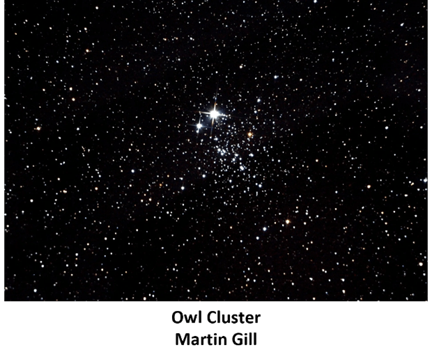 However, the most striking cluster in Cassiopeia is the Owl Cluster [4], also known as the ET Cluster after the extra-terrestrial in Steven Spielberg’s film. It gets its nicknames from a pair of fairly bright stars at the top of the cluster which are the “eyes” and the rest of the cluster forms the “body”. The brighter of the pair is Phi Cassiopeiae, a yellow star of magnitude 5.0; it is probably a foreground star and not part of the cluster. The Owl Cluster (NGC 457 or Caldwell 13) is about 8,000 light years away and around 21 million years old. It lies between Ruchbah and Achird. Finally, the beautiful circular cluster NGC 7789 [5] lies between Sigma Cassiopeiae and Rho Cassiopeiae (its magnitude varies between 4.1 and 6.2) above it. It was discovered by Caroline Herschel in 1783 and is known as Caroline’s Rose because of its “petals”. It is about 8,000 light years distant like the Owl Cluster, and is a very old cluster, with an estimated age of 1,600 million years.