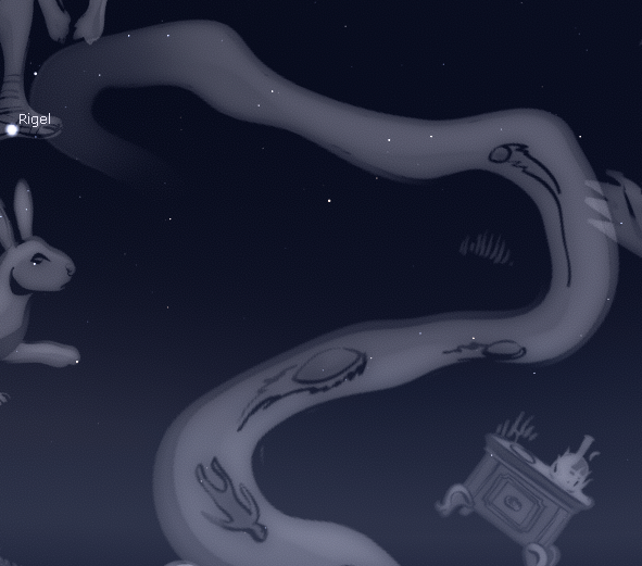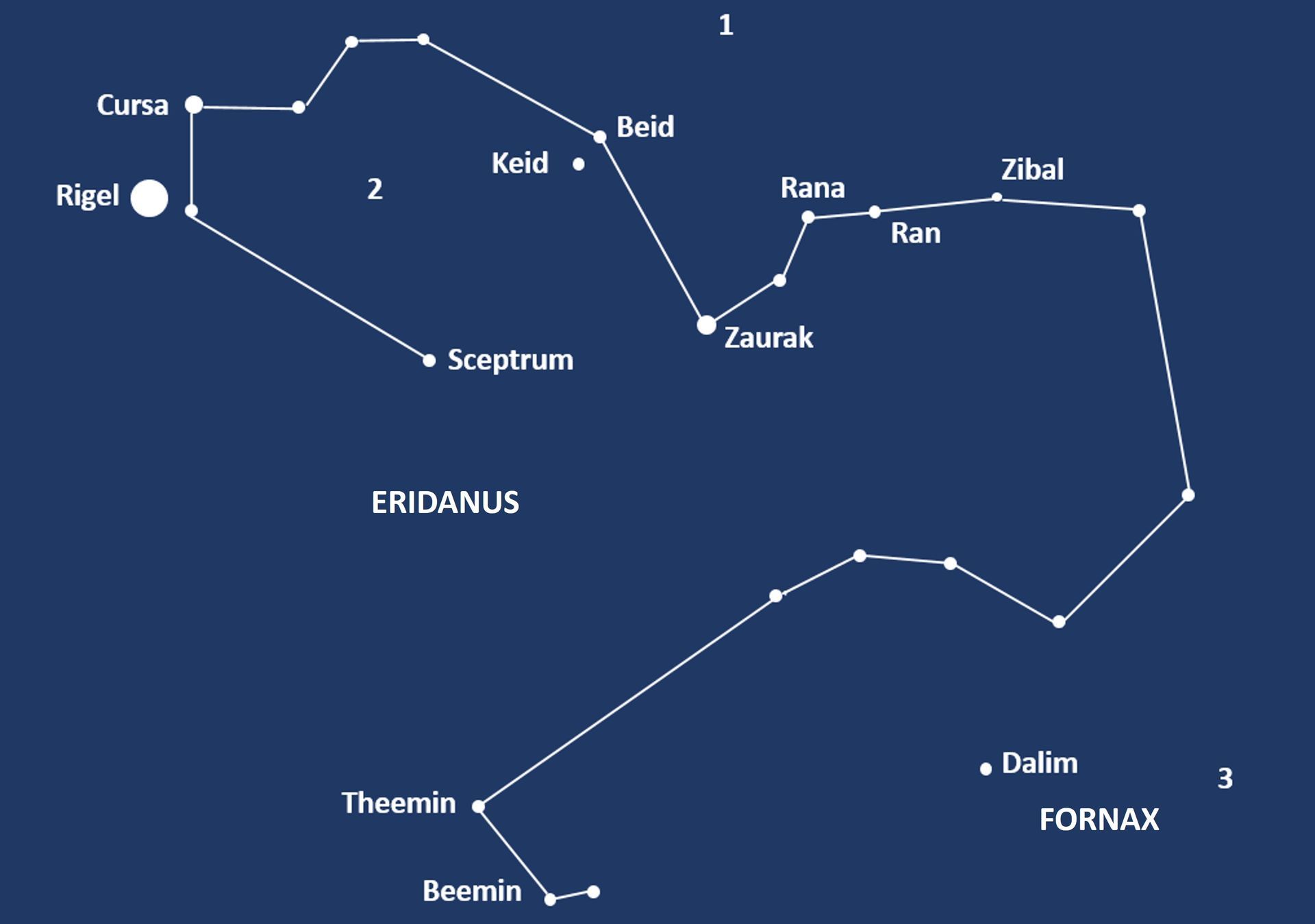 Eridanus is an ancient constellation with a complex history. It may be connected to one of the very first cities, Eridu, which lay on the Euphrates near modern Basra, and their constellation was then taken over by the Ancient Greeks. The Romans called the River Po 'Eridanus' and it has also been linked to the Nile. In Greek mythology, Phaethon, the son of the Sun god, borrowed his father’s chariot, but lacking any driving skills, he swerved between the Earth and the heavens, scorching both of them. Zeus struck him dead with a thunderbolt and he fell to Earth. Eridanus with its bends and turns represented the path he took.