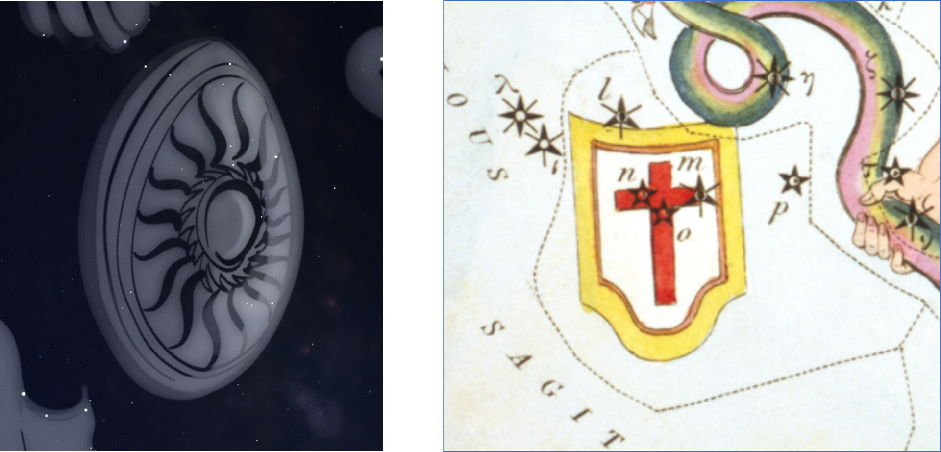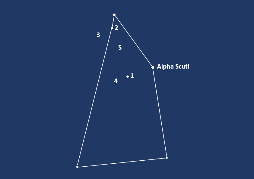 Scutum is one of these early modern constellations with a political agenda that nearly did not make the final cut in 1922. Where now are the similar constellations Harpa Georgii, Sceptrum Brandenburgicum or Taurus Poniatovii (for which see Ophiuchus and Serpens)? The Danzig astronomer Johannes Hevelius introduced Scutum Sobiescianum in 1684 to honour King John III Sobieski of Poland who provided Hevelius with assistance after his observatory had been destroyed in a fire in 1679. It was not universally popular with astronomers. John Flamsteed, for example, allocated its few stars to Aquila. However, the small constellation had a powerful ally in American-Argentinian astronomer Benjamin Apthorp Gould, for it was Gould’s reform of the constellations that paved the way for the final determination of the modern constellations in the 1920s. Perhaps one element in its survival was the conversion of the clearly honorific Scutum Sobiescianum into the more mundane Scutum. The constellation is an irregular quadrilateral with four major stars which are all fourth or fifth magnitude; the brightest is Alpha Scuti which is magnitude 3.8. As such, it is pretty well invisible, but it lies in a rich region of the Milky Way not far from the galactic centre.