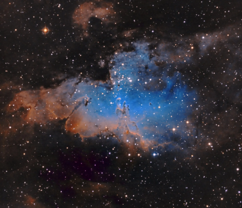 Serpens Caput contains the globular cluster Messier 5 [1] which is bright (magnitude 5.6), although it is a considerable 24,500 light-years distant. It is estimated to be 10.6 billion years old and contains a significant number of RR Lyrae variables. It was discovered by the German astronomer Gottfried Kirch in 1702. Over in the south-eastern corner of Serpens Cauda is Messier 16 [2], better known as the Eagle Nebula because of its bird-like shape in larger telescopes (see image). It is an emission nebula with an associated star cluster. It contains the star-forming pillars of gas and dust made famous by the Hubble Space Telescope, called “The Pillars of Creation”. Even now, the young stars within this cloud are pushing the cold gas away and eventually (after millions of years) it will become an ordinary star cluster like the Pleiades.