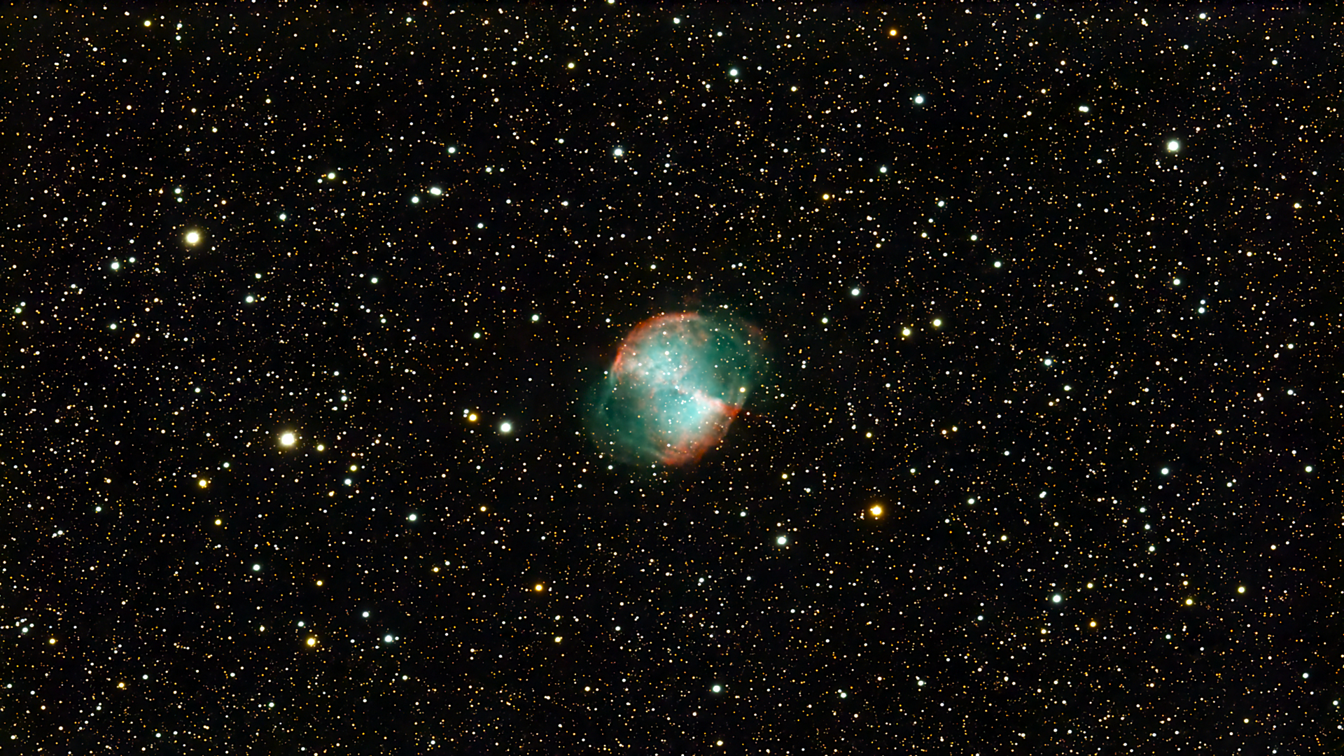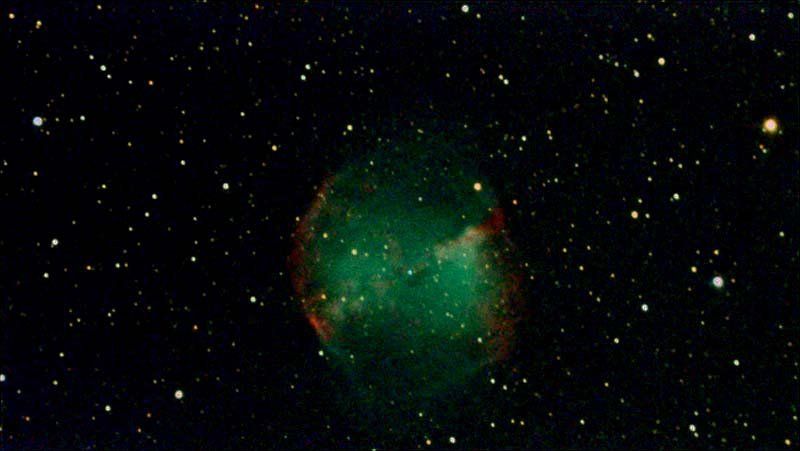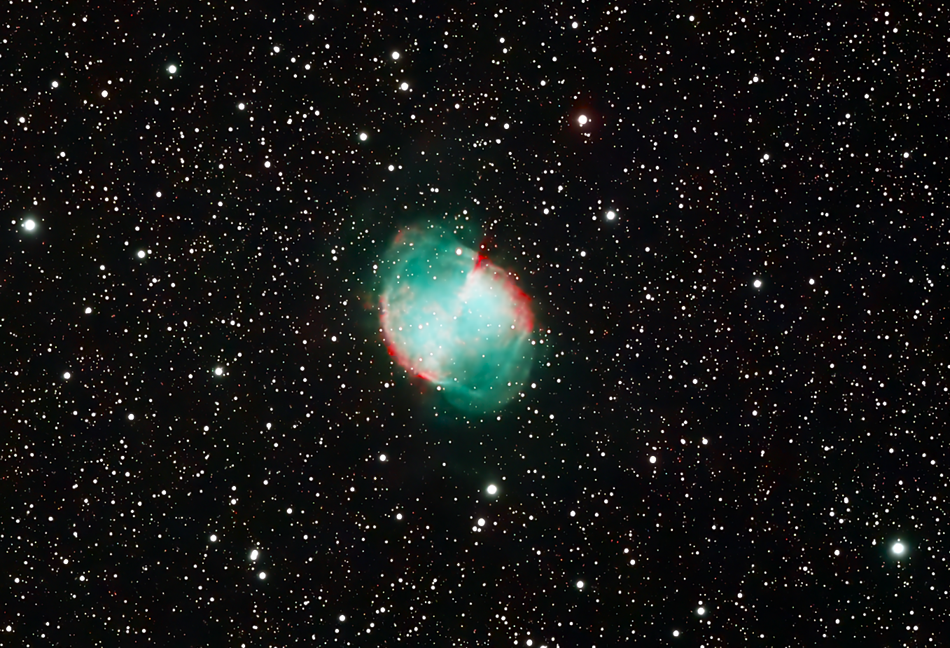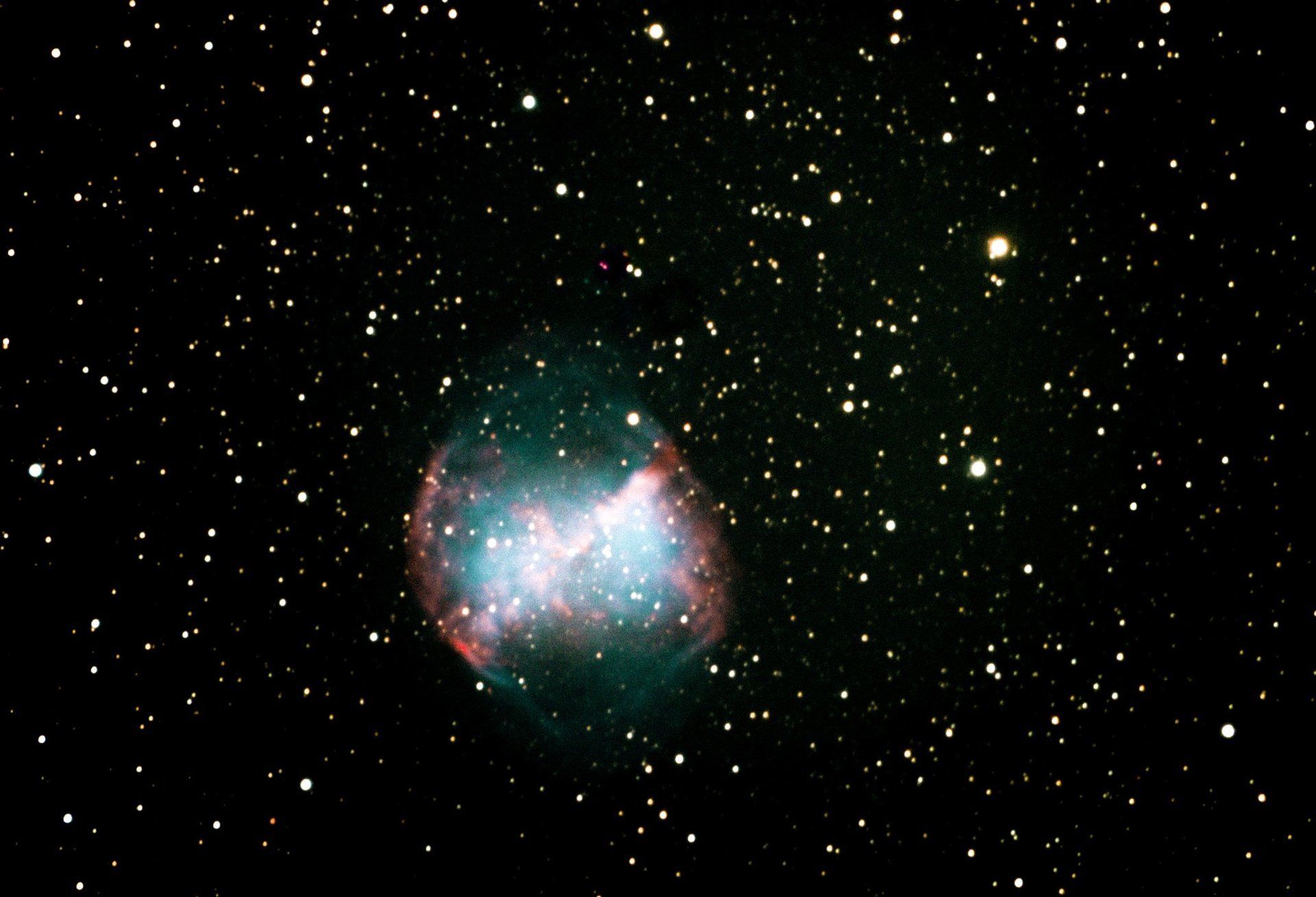 The Dumbbell Nebula (also known as Apple Core Nebula, Messier 27, M 27, or NGC 6853) is a planetary nebula in the constellation Vulpecula, at a distance of about 1,360 light-years. This object was the first planetary nebula to be discovered; by Charles Messier in 1764. At its brightness of visual magnitude 7.5 and its diameter of about 8 arcminutes, it is easily visible in binoculars,[5] and a popular observing target in amateur telescopes.