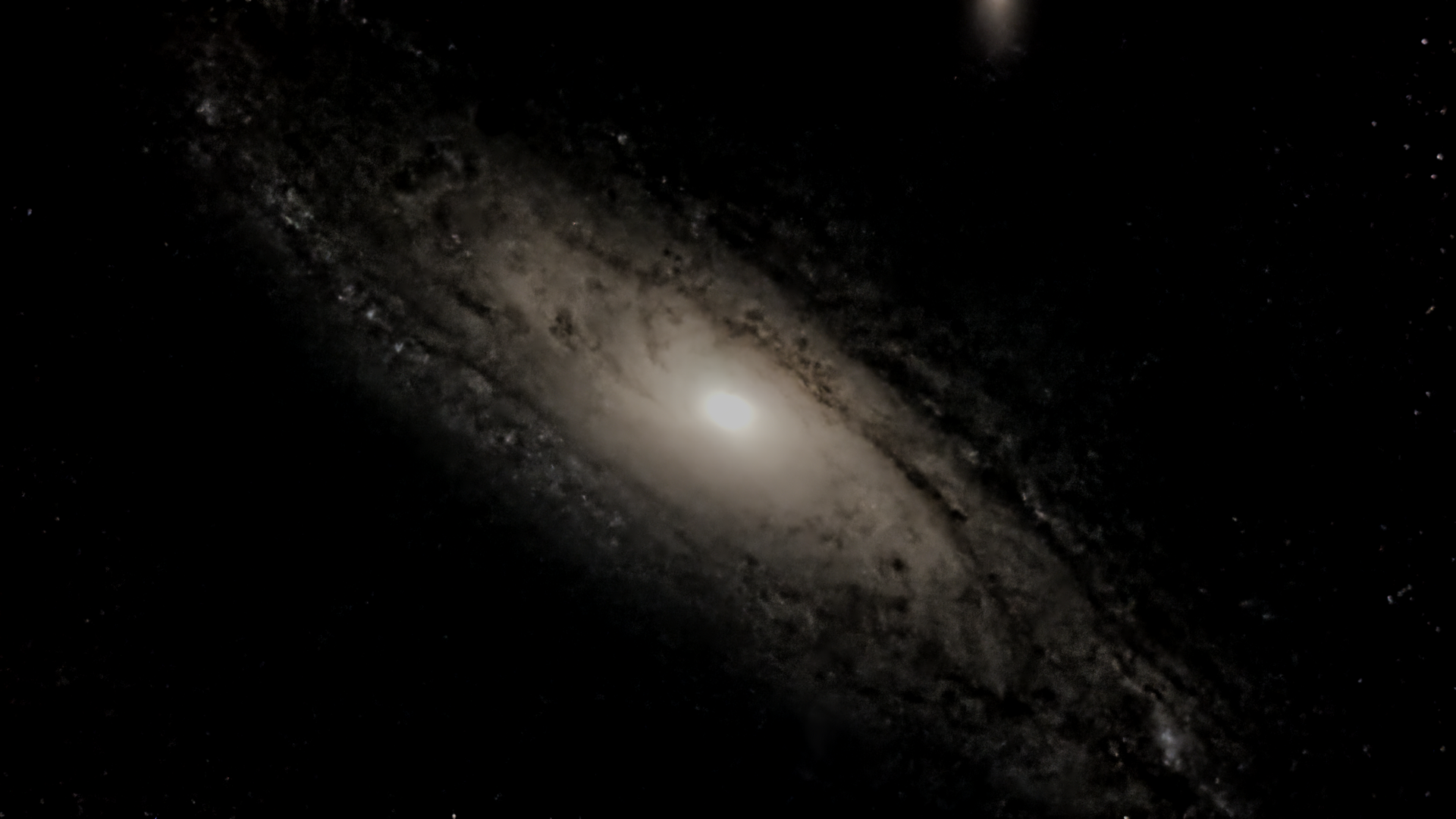 About half of the Andromeda's satellite galaxies are orbiting the host galaxy along a highly flattened plane, with 14 out of 16 following the same sense of rotation. One theory proposes that these objects once belonged to a subhalo surrounding NGC 205, then the group was broken up by tidal forces during a close encounter with Andromeda.