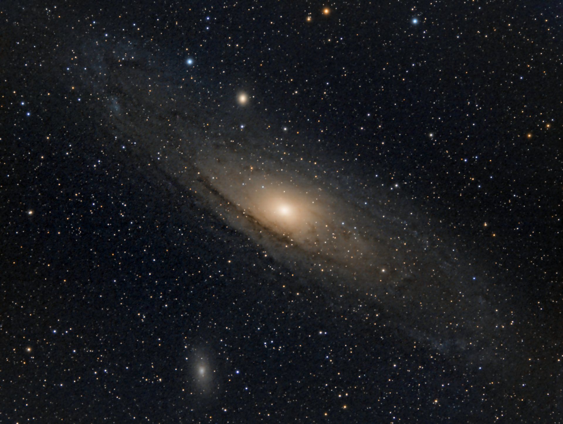 The Milky Way and Andromeda galaxies are expected to collide in ~4.5 billion years, merging to form a giant elliptical galaxy or a large disc galaxy. With an apparent magnitude of 3.4, the Andromeda Galaxy is among the brightest of the Messier objects making it visible to the naked eye on moonless nights, even when viewed from areas with moderate light pollution.