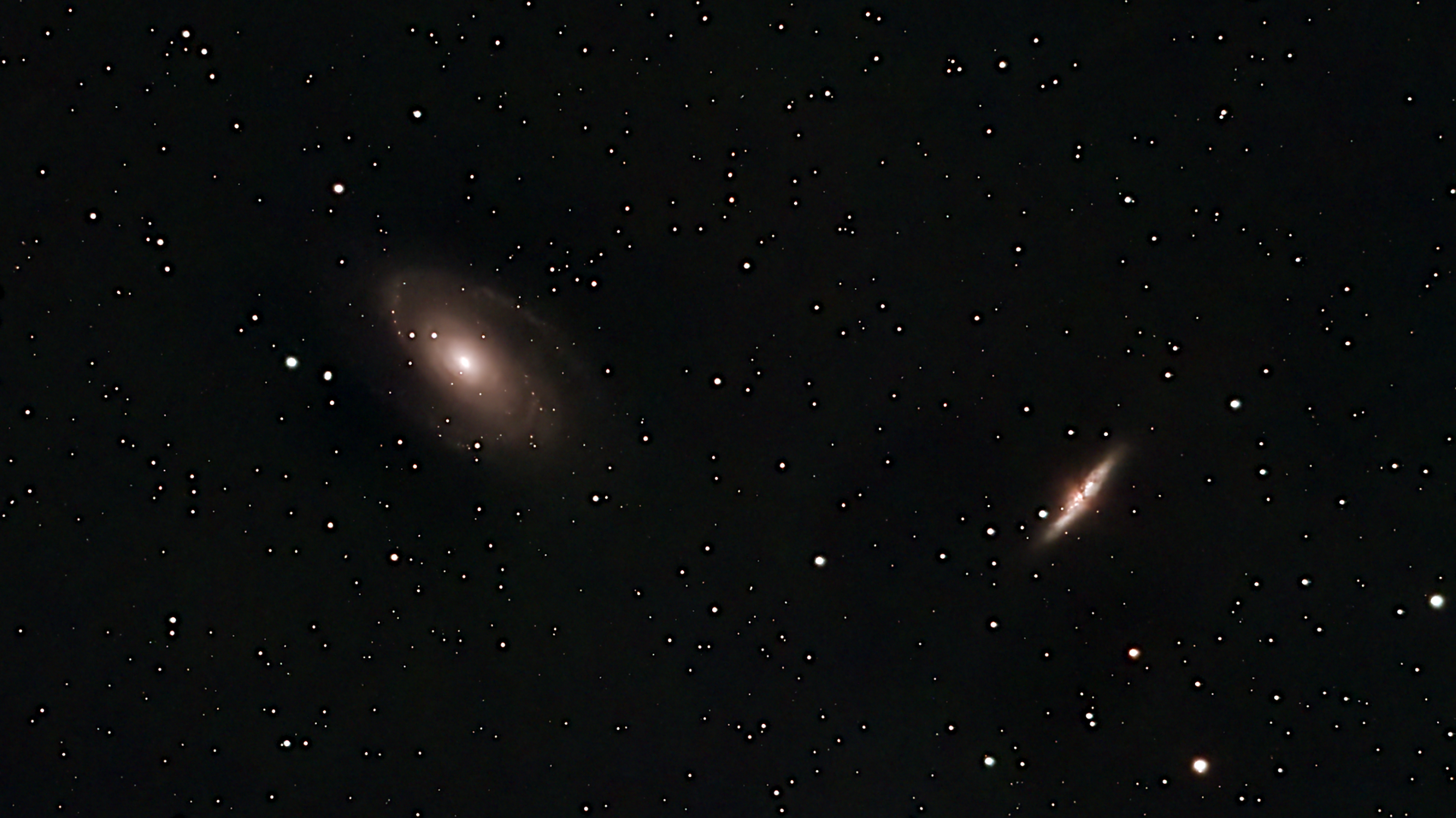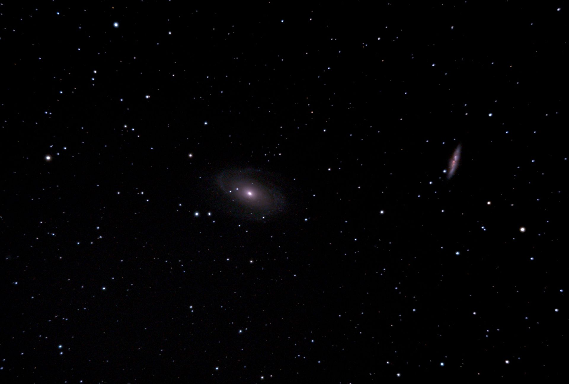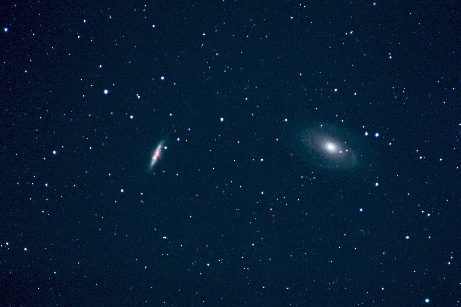 Messier 81 and Messier 82 can both be viewed easily using binoculars and small telescopes. The two objects are generally not observable to the unaided eye, although highly experienced amateur astronomers may be able to see Messier 81 under exceptional observing conditions with a very dark sky. Telescopes with apertures of 8 inches (20 cm) or larger are needed to distinguish structures in the galaxy. Its far northern declination makes it generally visible for observers in the northern hemisphere. It is not visible to most observers in the southern hemisphere, except those in a narrow latitude range immediately south of the equator.
