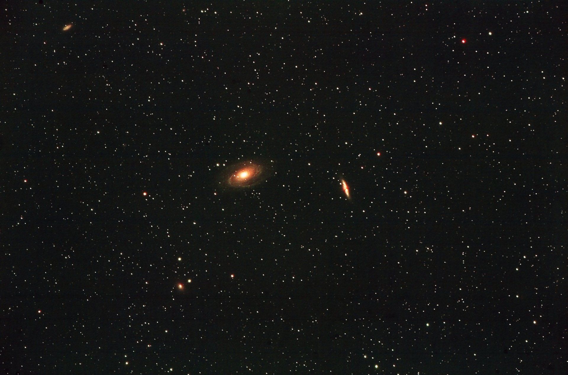 Messier 81 is the largest galaxy in the M81 Group, a group of 34 galaxies located in the constellation Ursa Major. At approximately 11.7 Mly (3.6 Mpc) from the Earth, it makes this group and the Local Group, containing the Milky Way, relative neighbors in the Virgo Supercluster.