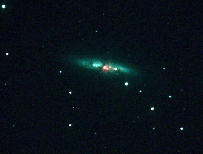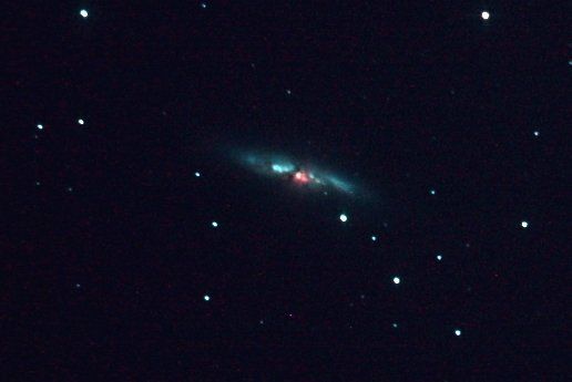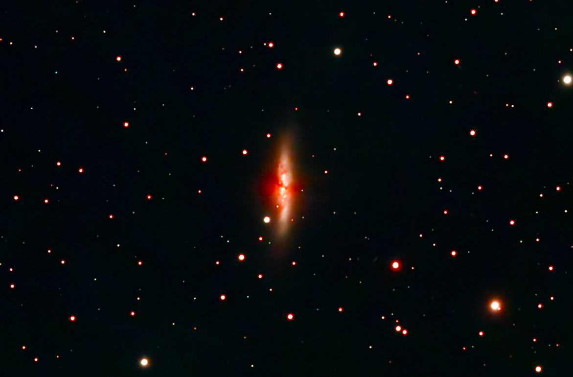 Messier 82 (also known as NGC 3034, Cigar Galaxy or M82) is a starburst galaxy approximately 12 million light-years away in the constellation Ursa Major. A member of the M81 Group, it is about five times more luminous than the whole Milky Way and has a center one hundred times more luminous than our galaxy's center. The starburst activity is thought to have been triggered by interaction with neighboring galaxy M81. As the closest starburst galaxy to Earth, M82 is the prototypical example of this galaxy type. SN 2014J, a type Ia supernova, was discovered in the galaxy on 21 January 2014. In 2014, in studying M82, scientists discovered the brightest pulsar yet known, designated M82 X-2.