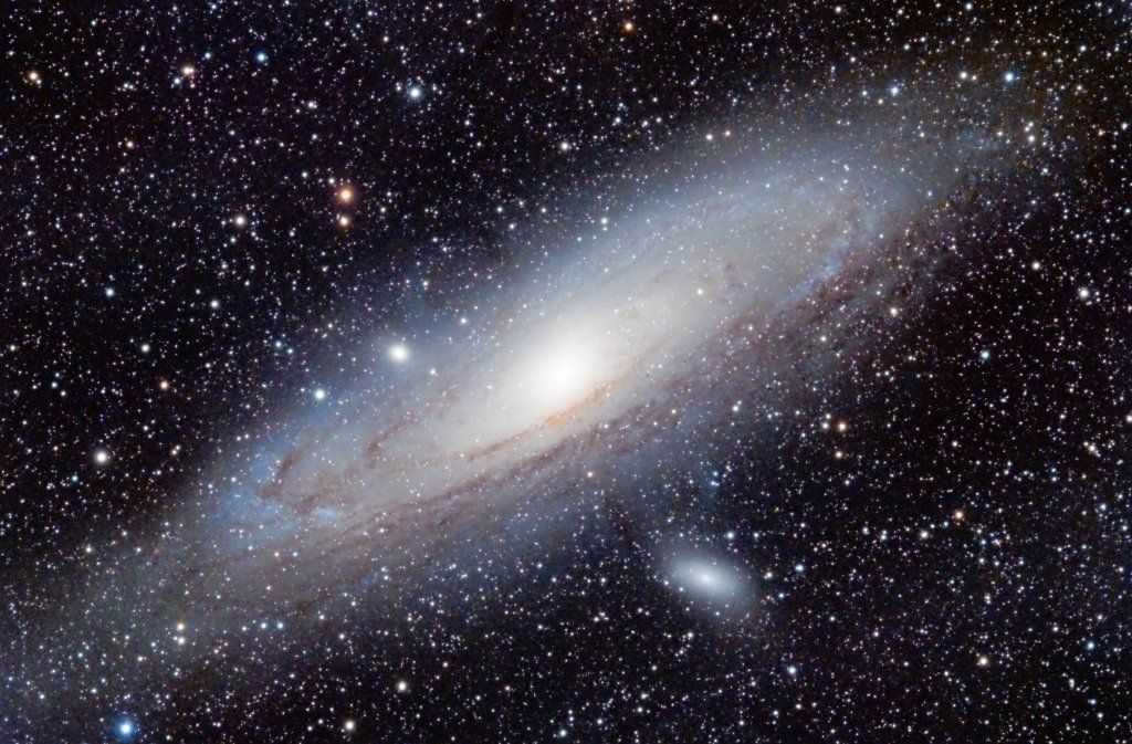 Clearly such a bright object should have been seen by the ancient astronomers and it is an indication of their fixation with stars and planets that the first observer to record it was the Persian astronomer Abd al-Rahman al-Sufi around 964. He described as a nebulous smear (compare my “silver glimmer”) and it became known as the little cloud (i.e. nubecula, hence nebula). It was first seen in a telescope by the German astronomer Simon Marius in 1612, and Charles Messier added it to his catalogue in 1764. The French mathematician Pierre Louis Maupertuis wondered as early as 1745 if it was an island universe, but nearly all observers (including William Herschel) up to the end of the nineteenth century thought it was a star cluster in the Milky Way Galaxy. Then in the early twentieth century, two facts began to disturb the accepted view. Vesto Slipher measured it to be the fastest rotating object in the Milky Way and Curtis Heber noted that the novae in the Andromeda Nebula were far fainter than other novae in the Milky Way; indeed a supernova observed in the Andromeda Nebula in 1885 was assumed to be a dim nova. Finally the debate about the location of the Andromeda Nebula was settled by Edwin Hubble in 1925 when he identified Cepheid variables in M31. As the absolute magnitude of a Cepheid variable can be calcuated (see Double Star of the Month for October 2019), it was easy to show that M31 must lie well outside our own galaxy. The hitherto Andromeda Nebula and its fuzzy relatives were indeed galaxies in their own right. It is now known to be 2.5 million light years away from us. It is disputed whether the Andromeda Galaxy is more massive than our own galaxy, most likely they are about the same mass (800 billion to a trillion solar masses). M31 is the largest of the galaxies near us in terms of its diameter, which is 220,000 light years; more than twice the size of our galaxy.