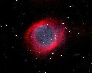 Once again we find ourselves back in the lower reaches of the sky. Even when the Helix Nebula is at the meridian it is only 17 degrees above the horizon. In theory its magnitude is a bright 7.6 but its low altitude will make it closer to 8.6 (about the same as M57) and as it is about the size of the full moon, its light is spread over a wide area. In short it is not easy to see visually although it is a splendid object for imagers. Perhaps for this reason, it escaped the attention of Charles Messier and William Herschel. It was discovered around 1824 by the German astronomer Karl Ludwig Harding who had previously discovered the asteroid (and dwarf planet) Juno in 1804. It is a planetary nebula which has a similar appearance to the better-known Ring Nebula (M57). It is a flattened spheroid which we observe from an angle of about 30 degrees from its equatorial plane. The nebula is about 655 light years away so it is the closest planetary nebulae to us and it is 2.5 light years wide. Like all planetary nebulae it is young and is reckoned to be 11,000 years old. The Helix nebula is located in a rather sparsely populated area in the southern part of Aquarius. It is roughly half-way between the bright but low star Fomalhaut and the rather dim star i Aquarii (mag. 4.3). The name Helix Nebula seems to have originated in the 1940s but like many such names did not really take off until the 1970s. It is also recently called the Eye of God, probably because of a famous false colour image taken by the Spitzer Space Telescope.